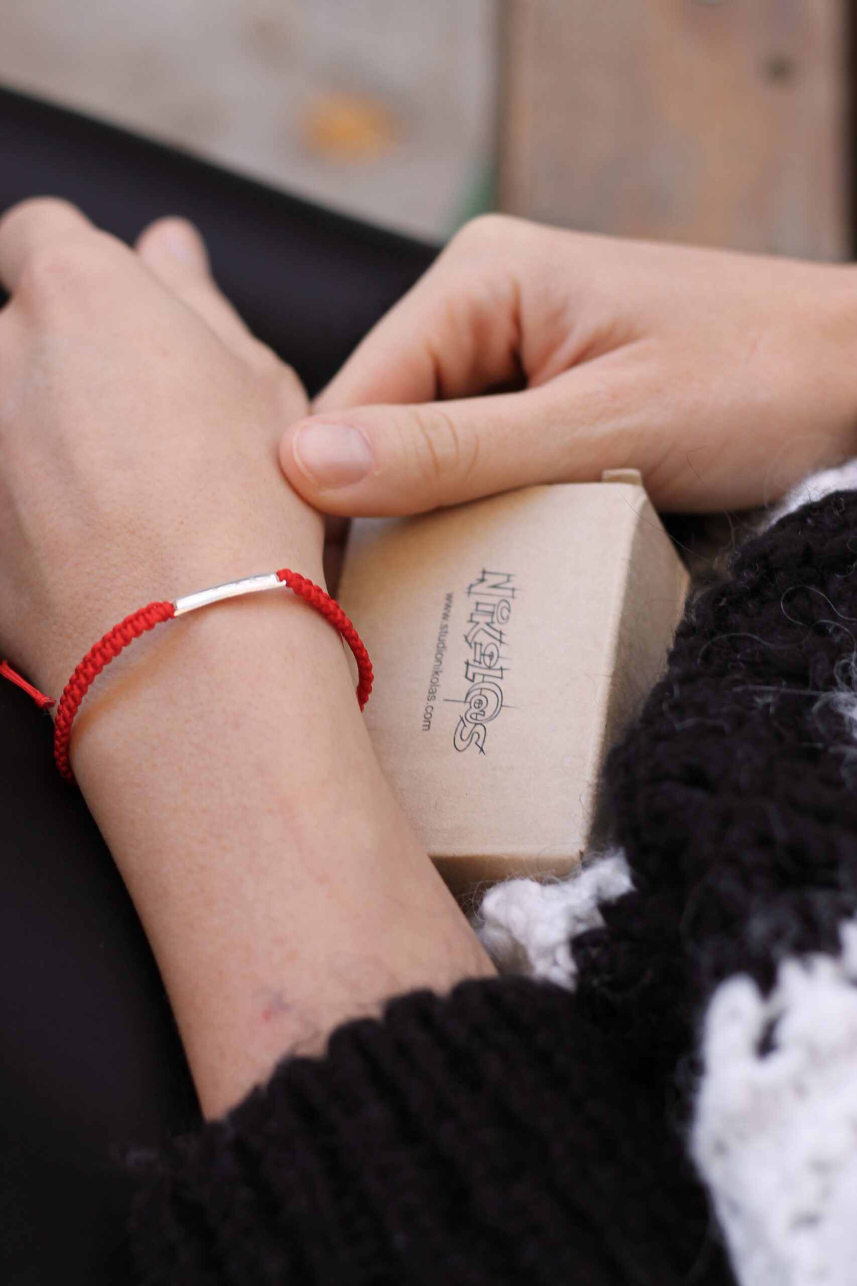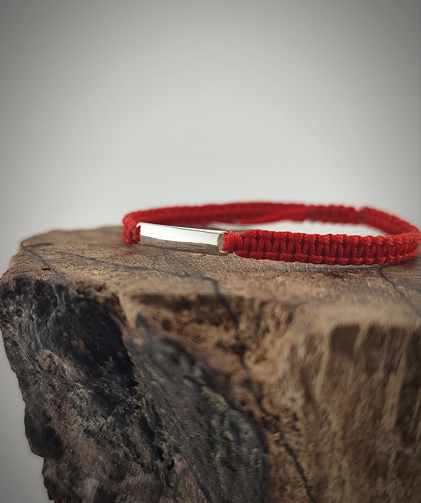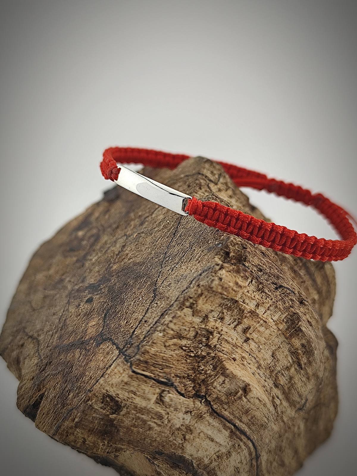 Плетена гривна с червен конец и сребърна плочка, върху която може да се гравира име, инициали, важна дата или дума с лично значение. Уникален аксесоар с емоционална стойност и елегантно излъчване.