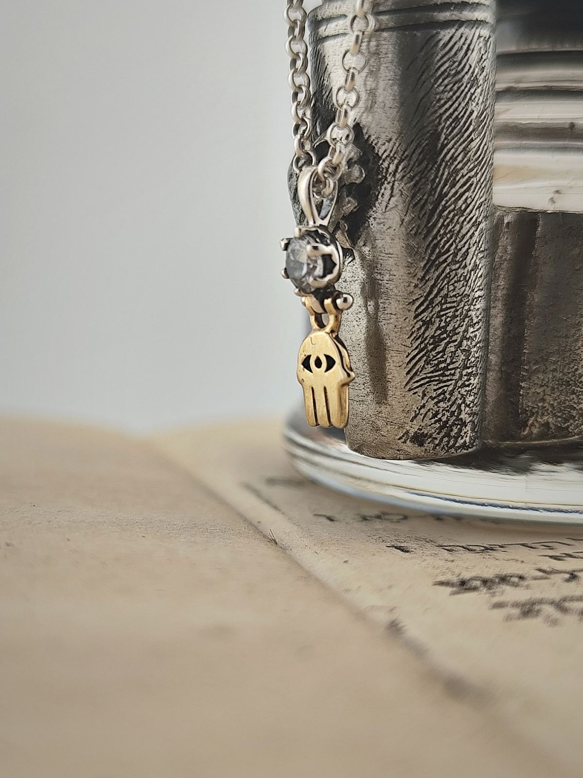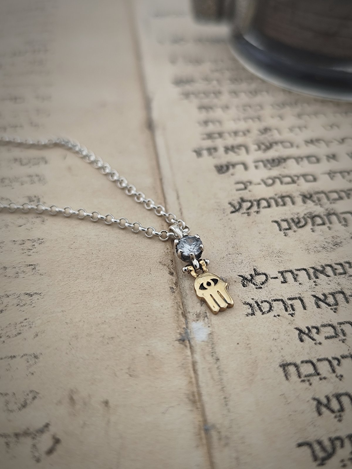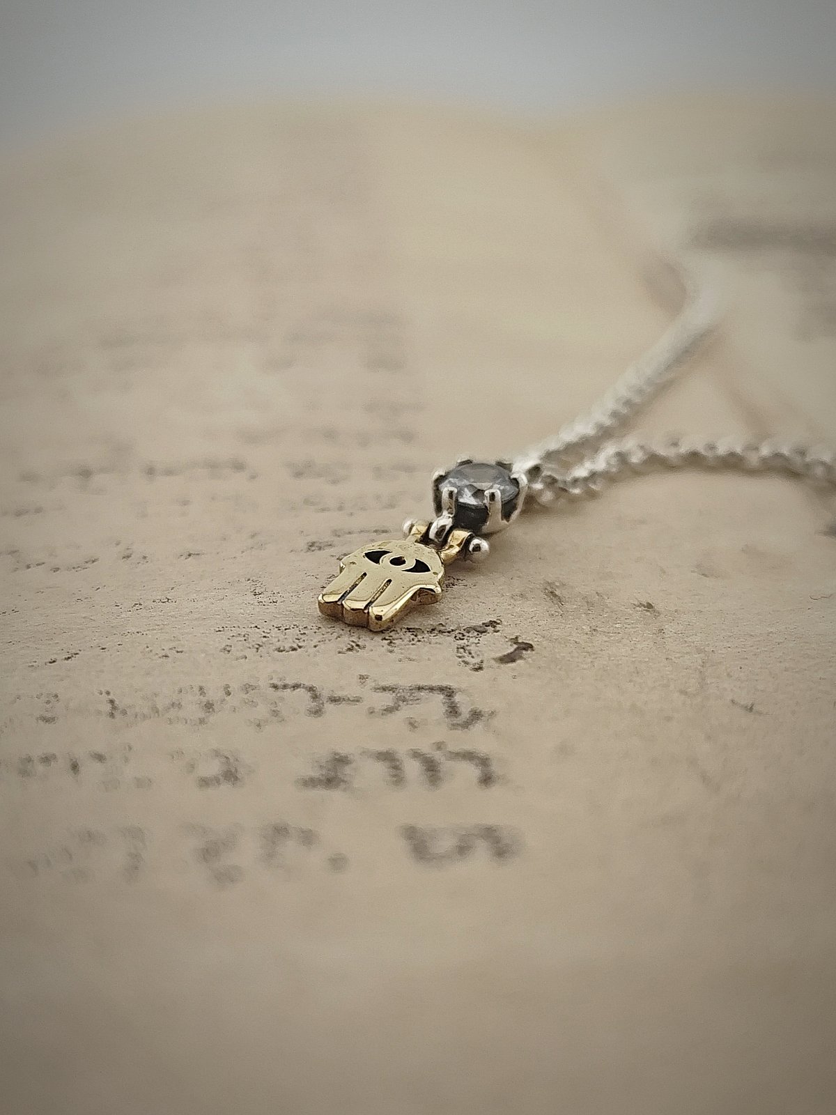 Кабала амулет от 14 каратово злато и сребро” Ръката на Фатима”, позната още като Хамса, която е осветена от блясъка на циркона.
