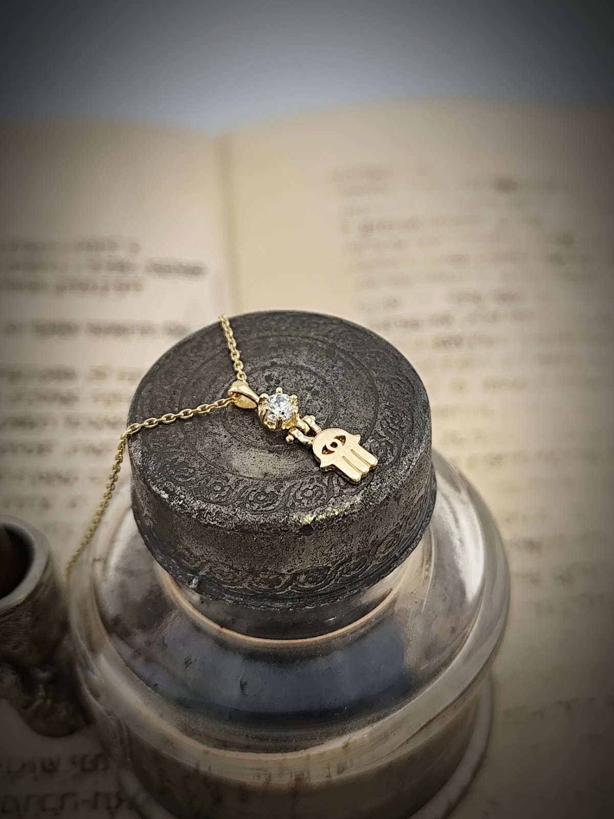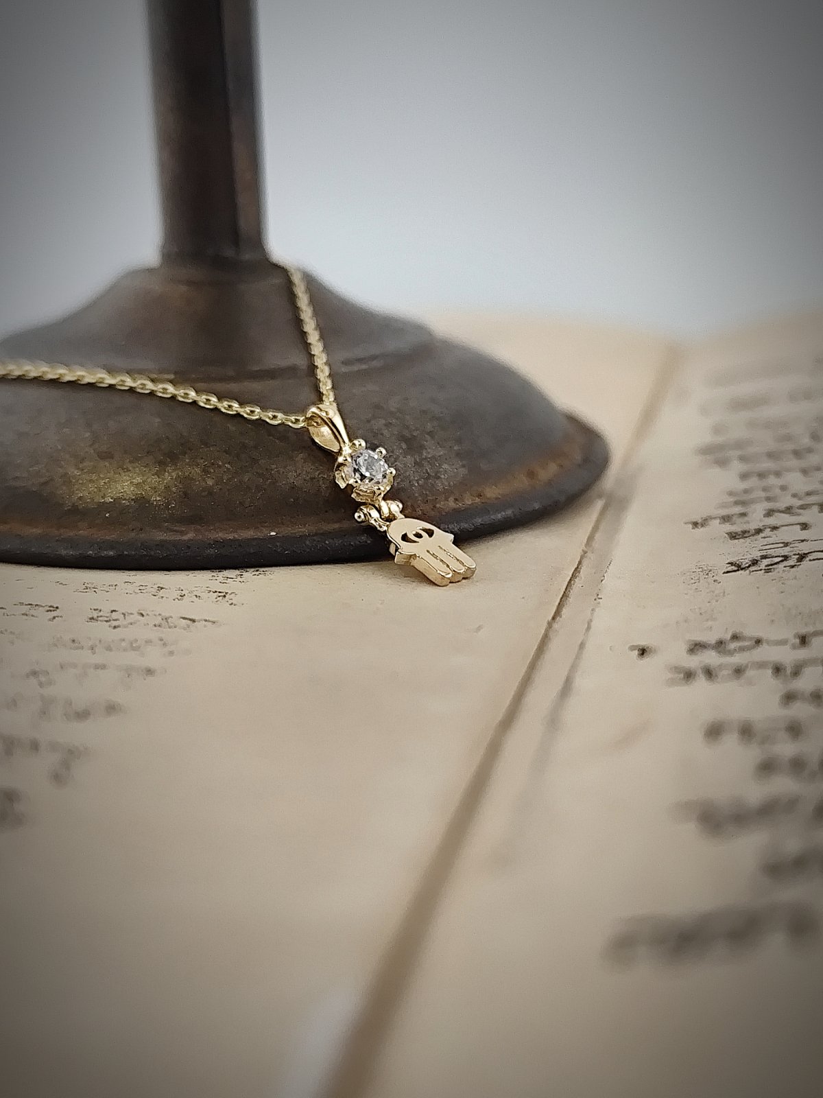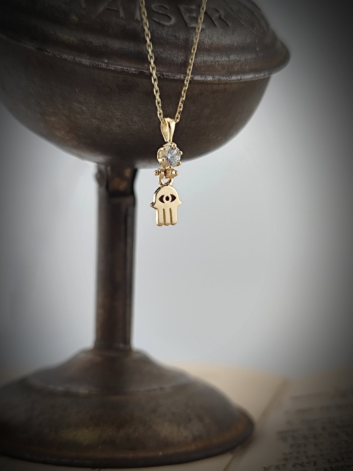 Кабала амулет от 14 каратово злато ” Ръката на Фатима”, позната още като Хамса, която е осветена от блясъка на циркона.