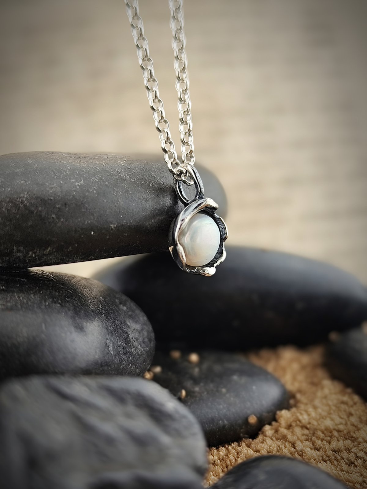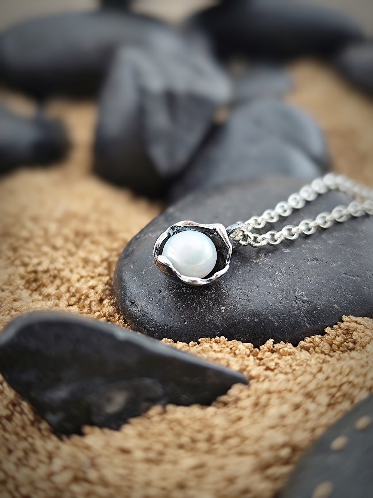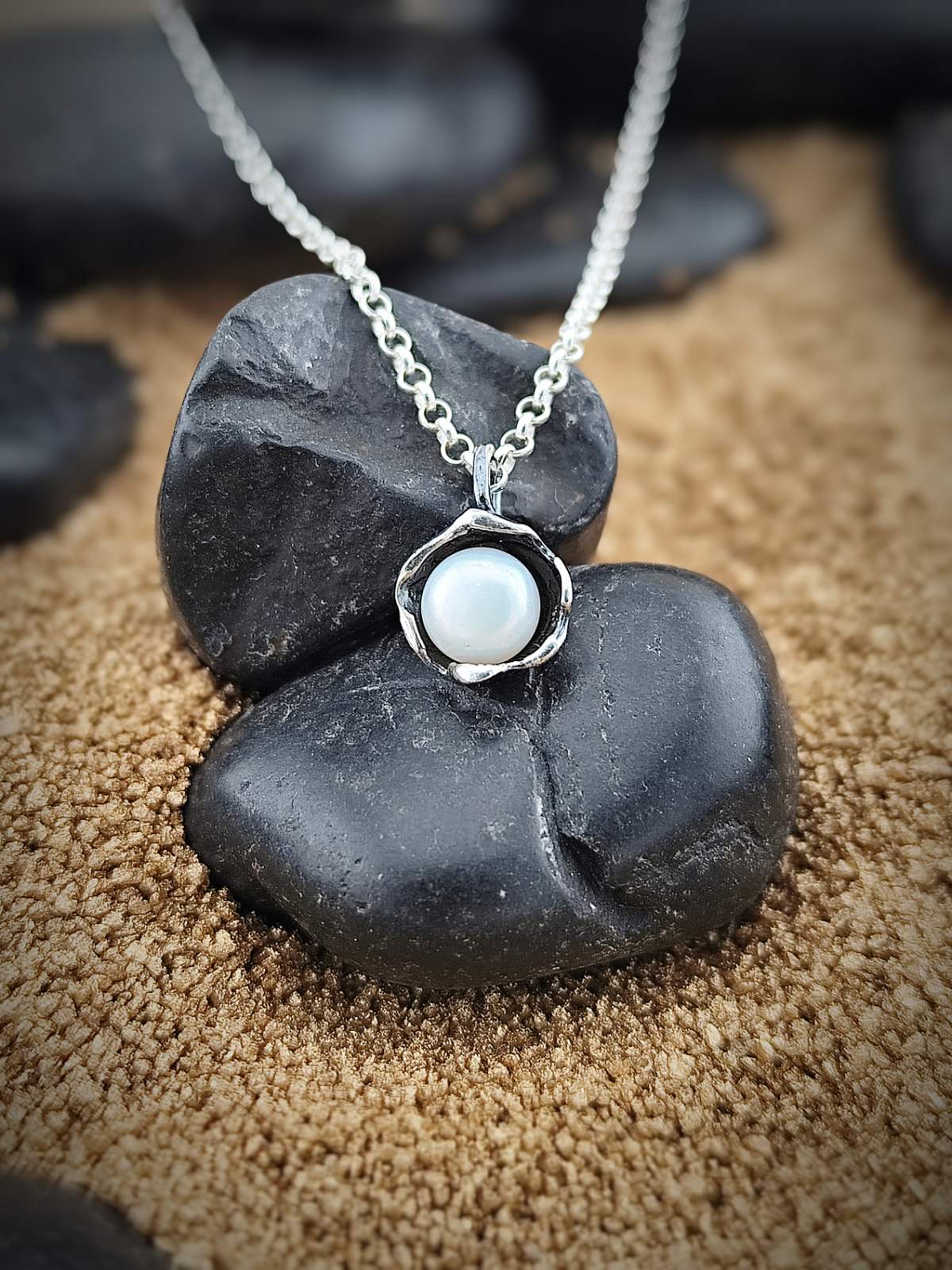 В центъра на медальона е поставена фино полирана перла, обгърната от изящен сребърен обков с органична, вълнообразна форма. Тази форма символизира движението на енергията и връзката между човека и природата.