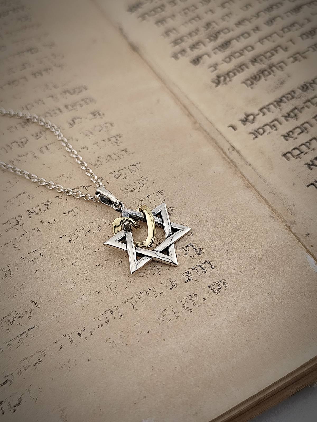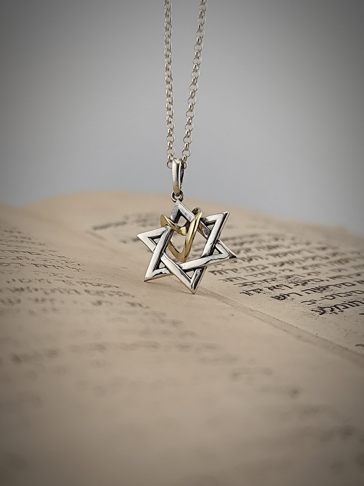 Кабала “ЗВЕЗДАТА НА ДАВИД” със сърце.Сребърен медальон МАГЕН ДАВИД – „ЗВЕЗДАТА НА ДАВИД“ със сърце от бижутериен месинг. Триизмерена, плътна и гладко преплетена висулка, красиво допълнена от подвижно сърце. Изработен е от 925 стерлингово сребро и е една от най-популярните символи на юдаизма, кръстена на цар Давид от Древен Израел. Амулета е прецизно изработен, а гладките ръбове го правят много удобен за носене.