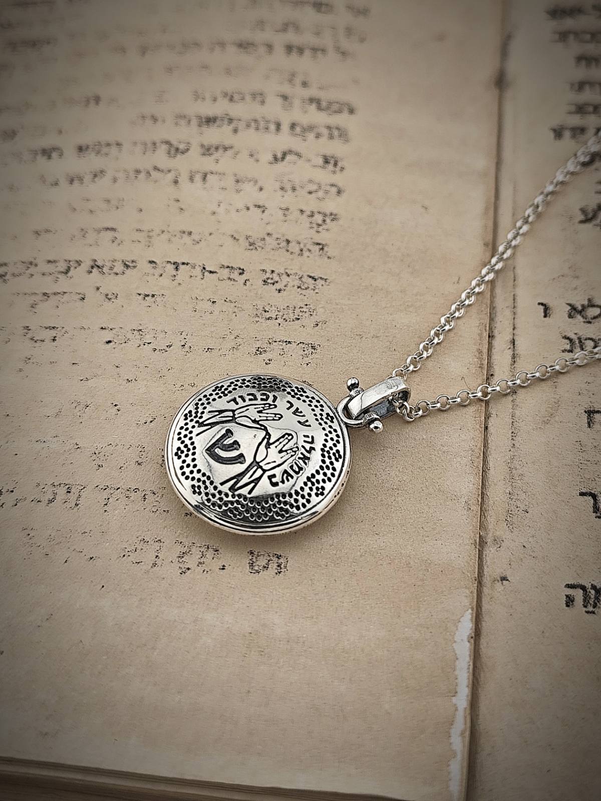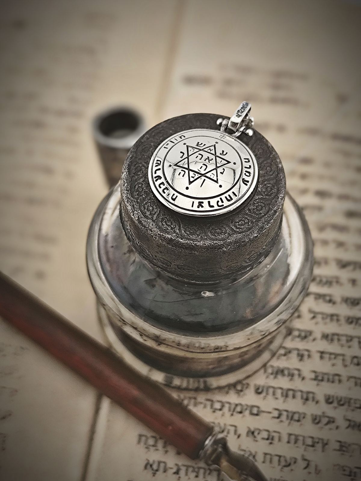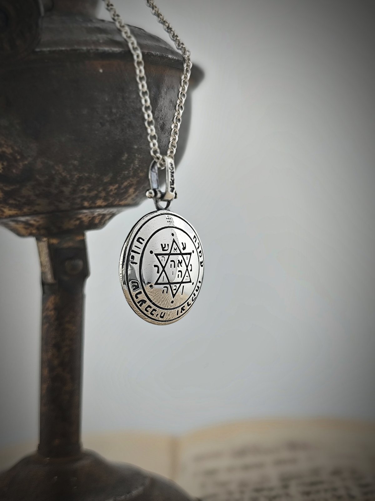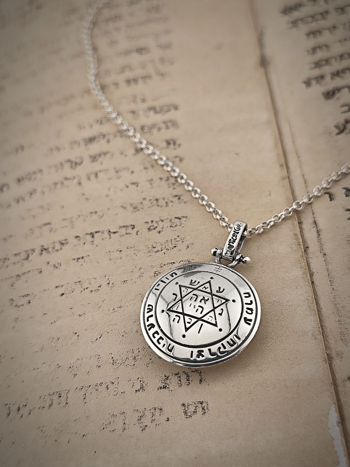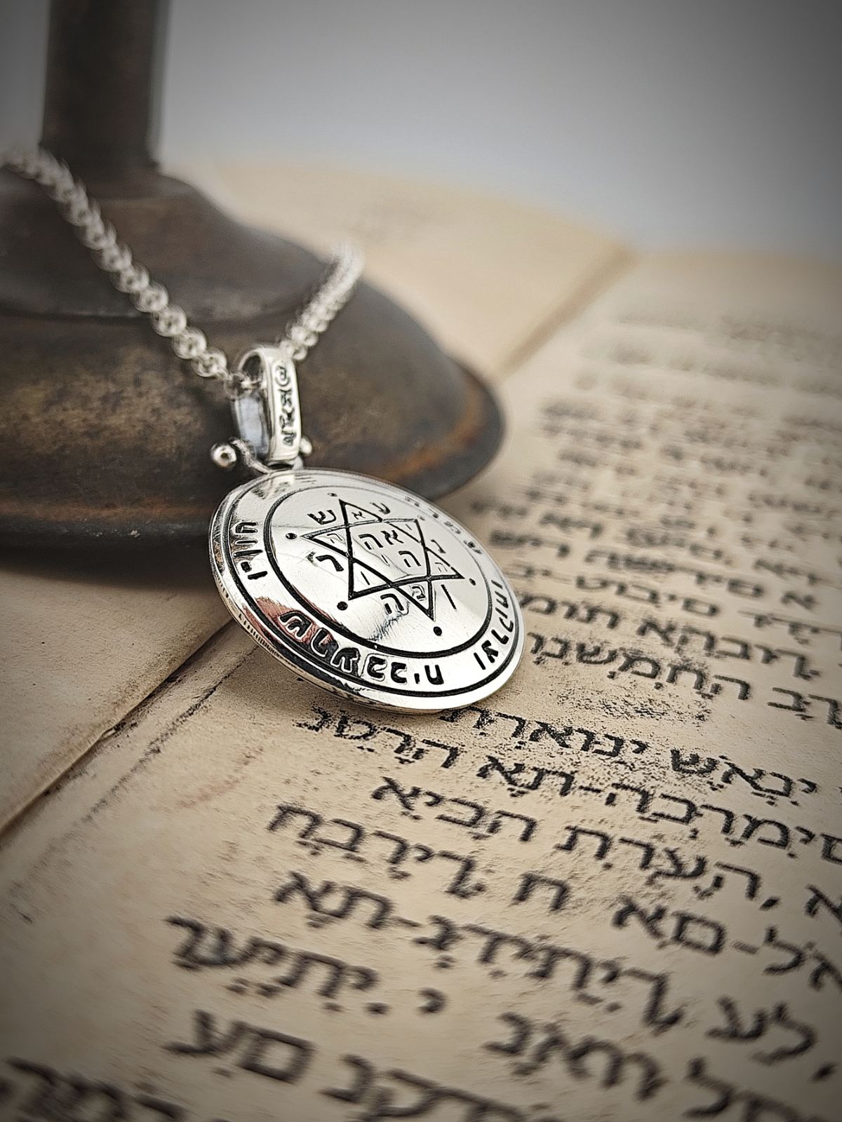 Печатът на Соломон, известен също като Sigillum Salomonis, е символ, който се свързва с цар Соломон в древността. Състои се от различни геометрични фигури и символи и според легендата може да се използва за призоваване и контрол на духове или демони. Кабала медальон Печат на Соломон#3. Втори пентакъл на Юпитер. Амулет за защита от врагове и зли духове. Вълшебният печат за придобиване на слава, почести, богатства и спокойствие на ума. Двулицев пендант от сребро 925, създаден във фабрика Студио Николас.