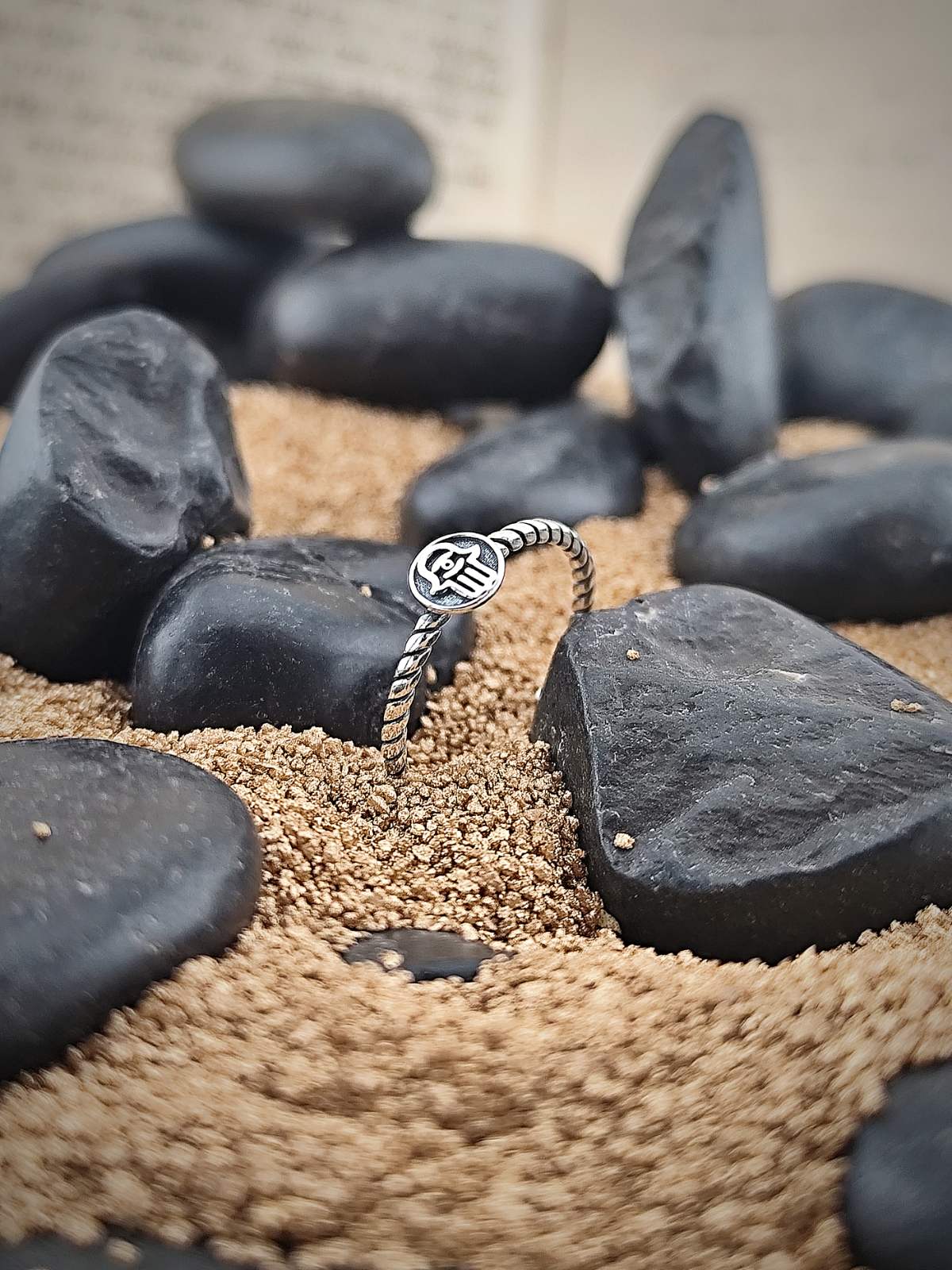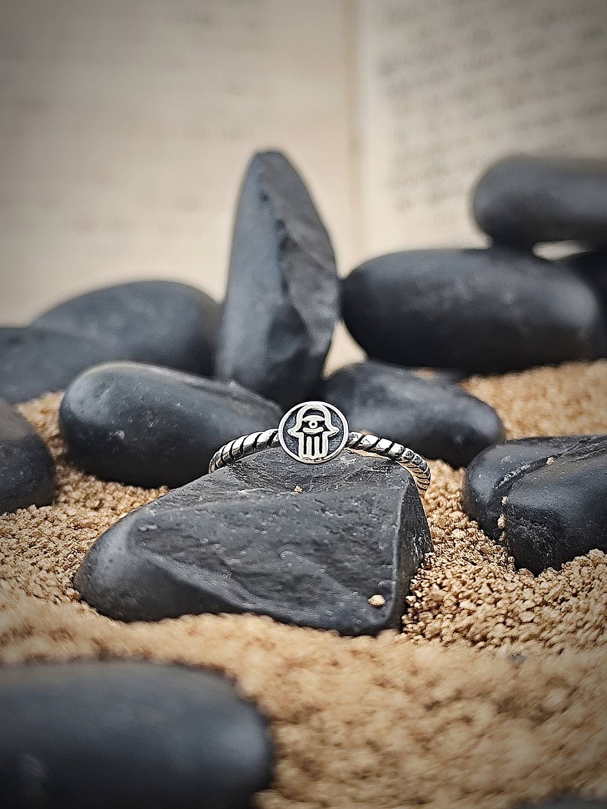 Кабала сребърен пръстен с изображение на “Хамса”. Хамса e изображение използвано в много култури и религии, включително юдаизма и исляма, като символ на защита и късмет. Смята се, че предпазва от зли очи, негативни енергии и други вредни влияния. Много хора носят хамса по формата на бижута или окачват декорации в домовете си за защита и късмет.