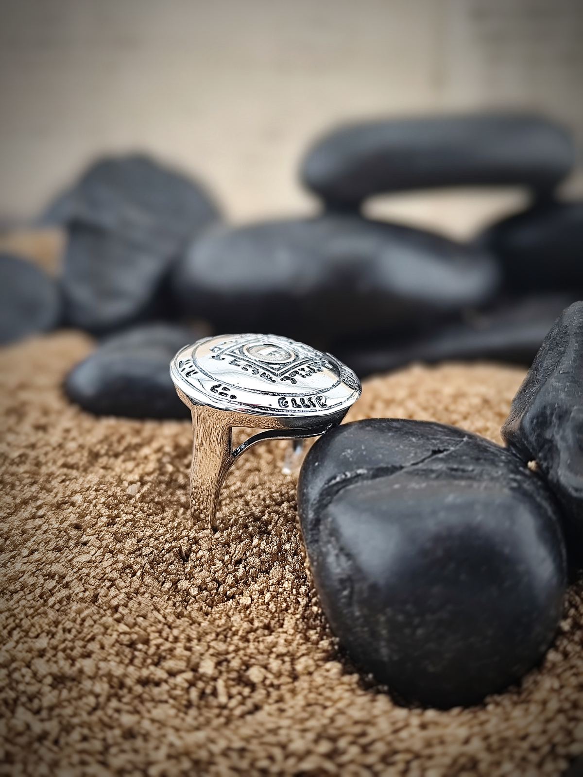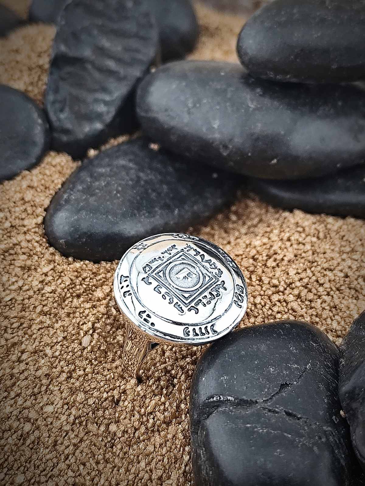 Невероятен ръчно изработен пръстен от сребро с пети пентакъл – талисман на Венера, един от церемониалната магическа символи на цар Соломон. Печат за бурна и страстна любов. Когато се показва на желаният от вас човек, той го вълнува и приканва към взаимна любов. Каталожен номер 1530R Студио Николас / тегло: 5,50гр / диаметър: 20мм. Перфектен подарък от сребро с марката Nikol@s.