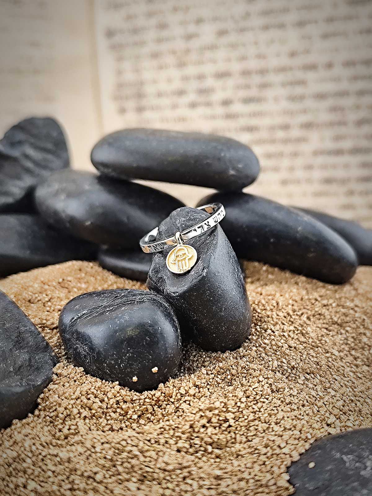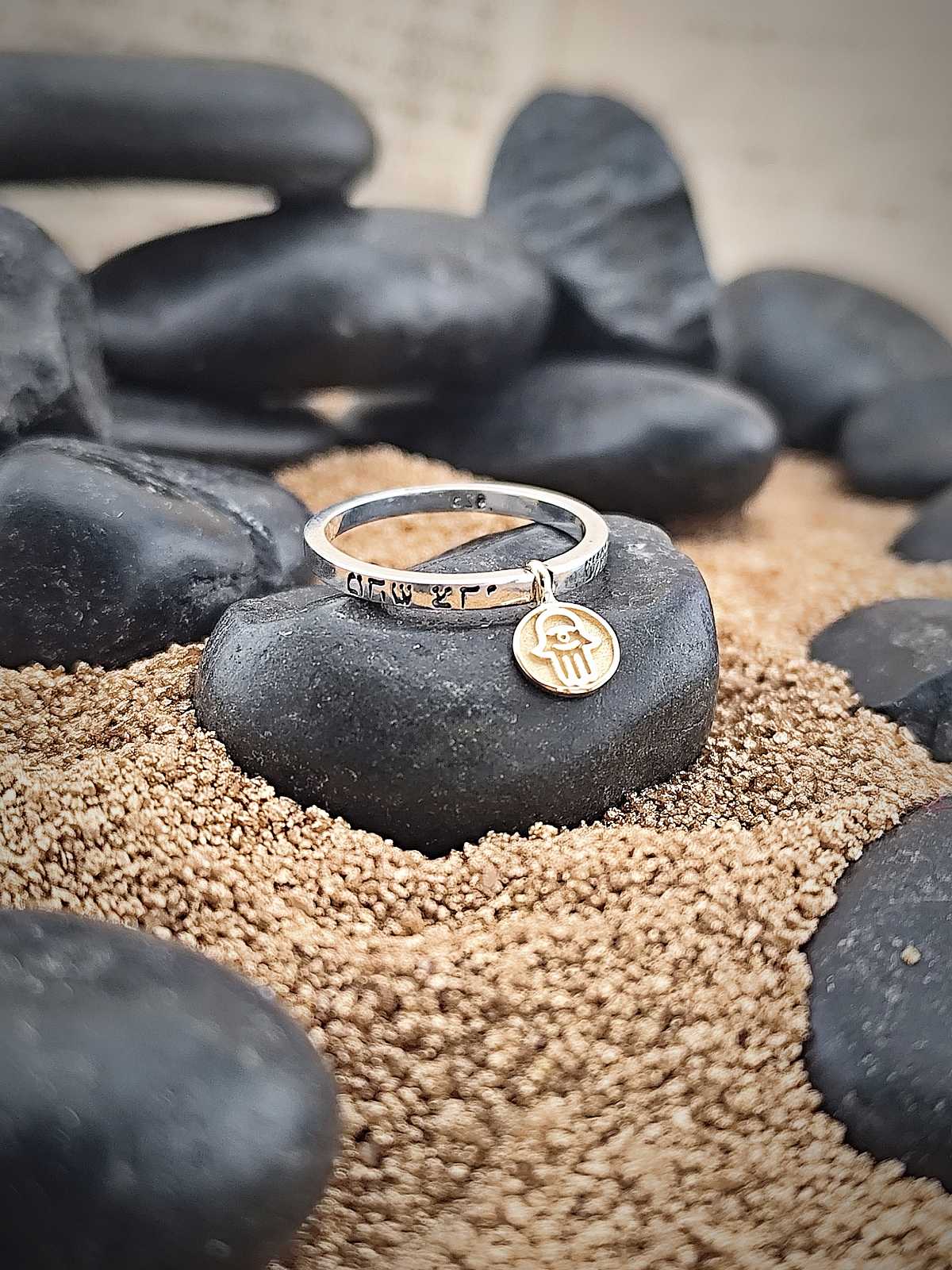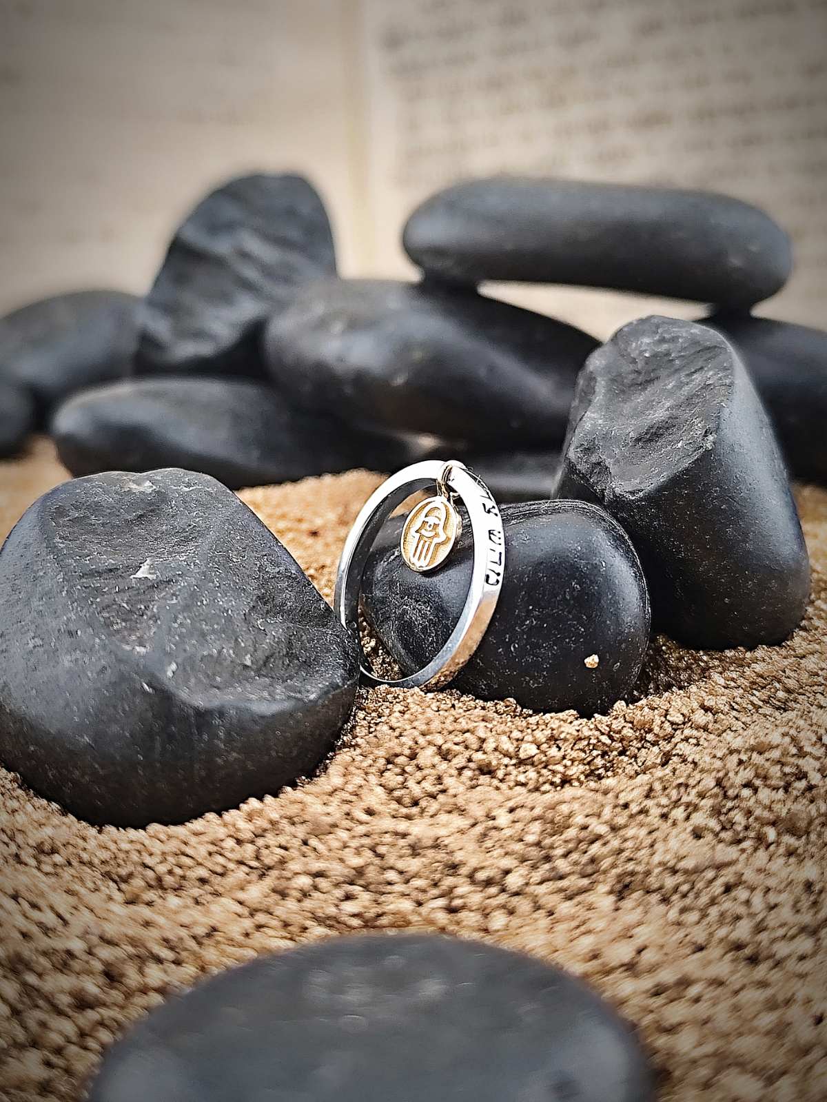 KABBALAH* пръстен “ХАМСА′′ – нашият амулет от сребро и 14 каратово злато за защита от зли очи и уроки, бижутерия Студио Николас. Ръчно изработен пръстен от стерлингово сребро 925 с подвижен златен елемент – изображение на древния източен символ за защита от зли очи и уроки “Ръката на Фатима” известен още “Хамса”. Изписаното „אהבתיך е част от стиха : ואהаבת עולם אהבתיך „И любовта на света е твоята любов“ Jeremiah 31.3