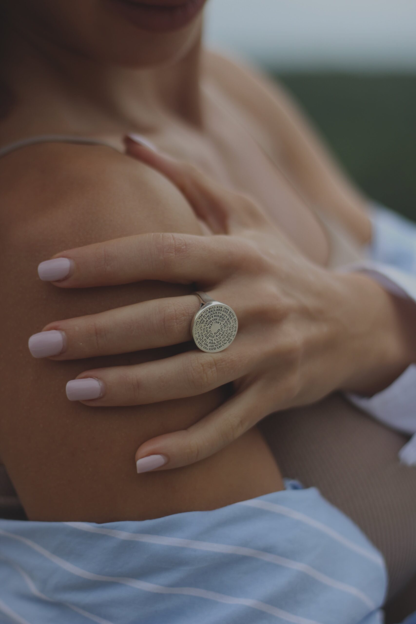 По кръглото тяло на пръстена са гравирани всичките 72 свети имена на Бог. Превъзходно изработеният пръстен от сребро се превръща в ценна реликва за поколения наред! Не само красива, но и изпълнена с дълбок смисъл вещ. Наборът от стихове е основата, чрез която се пренареждат в 72 думи от три букви, всяка от които представлява едно от тайните свети имена на Хашем/БОГ/.