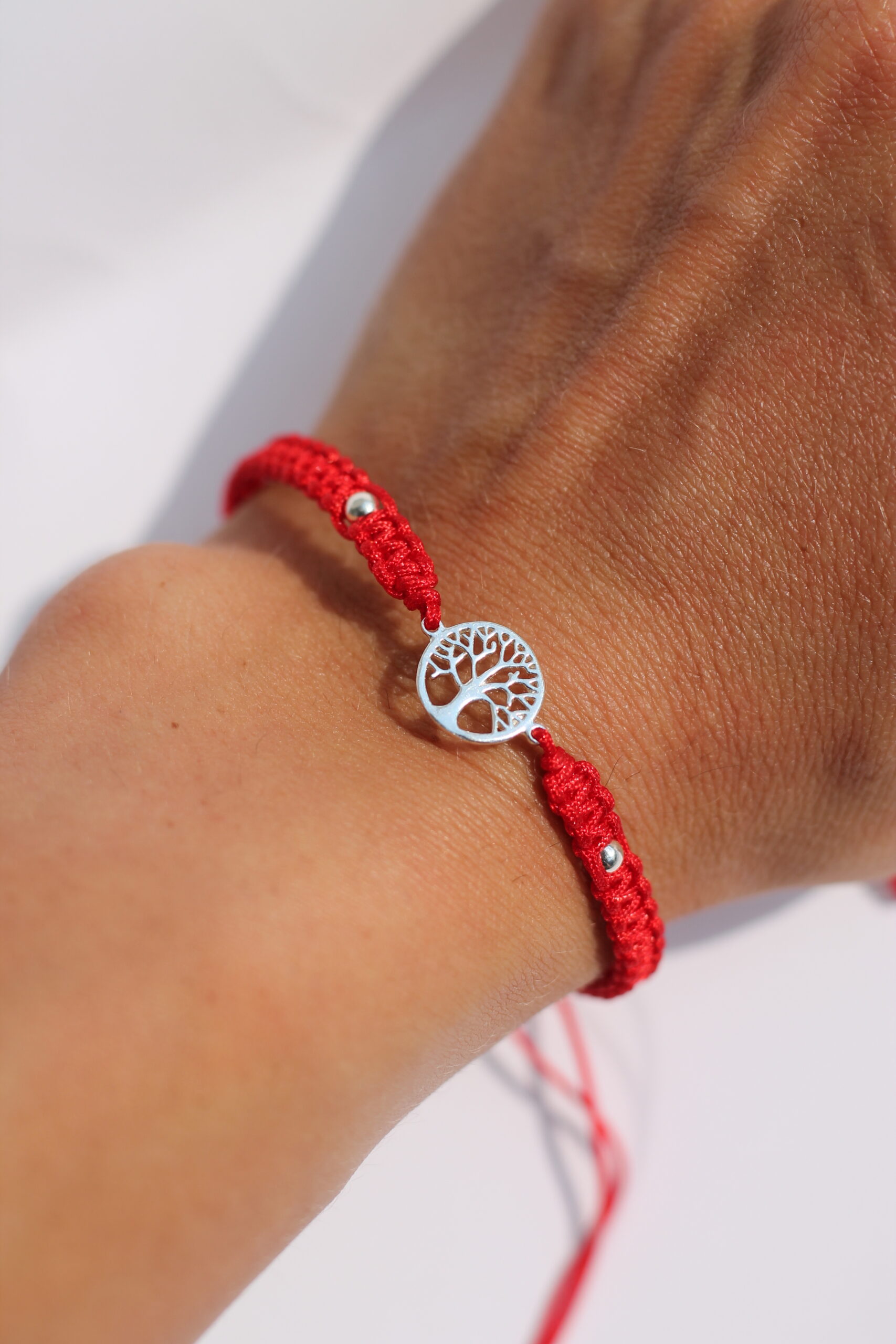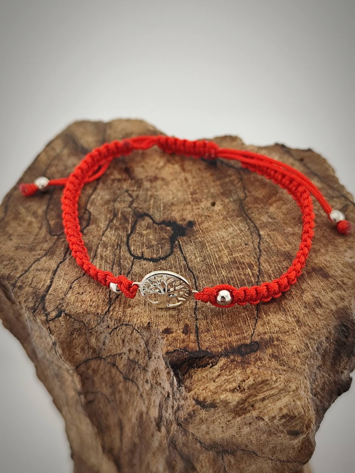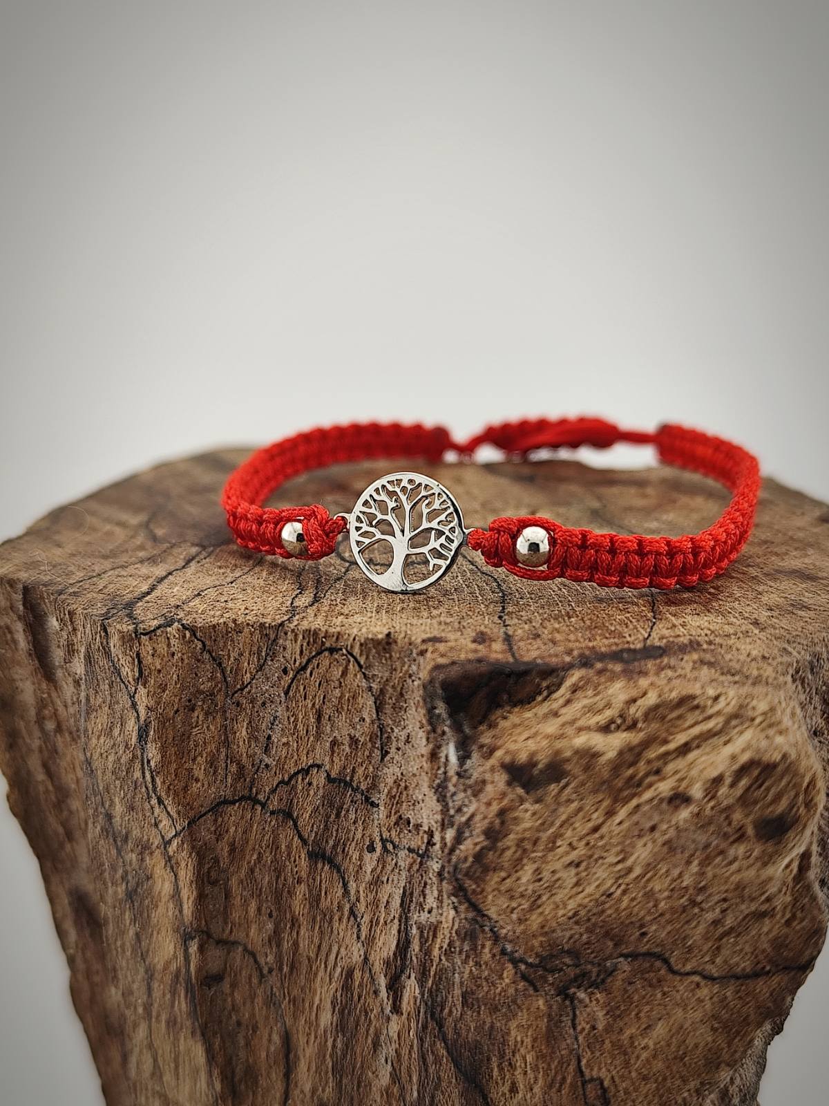 Ръчно изплетена гривна от червен конец с централен сребърен елемент „Дървото на живота“. Символ на защита, баланс и ново начало. Регулируем размер, удобна за ежедневно носене.