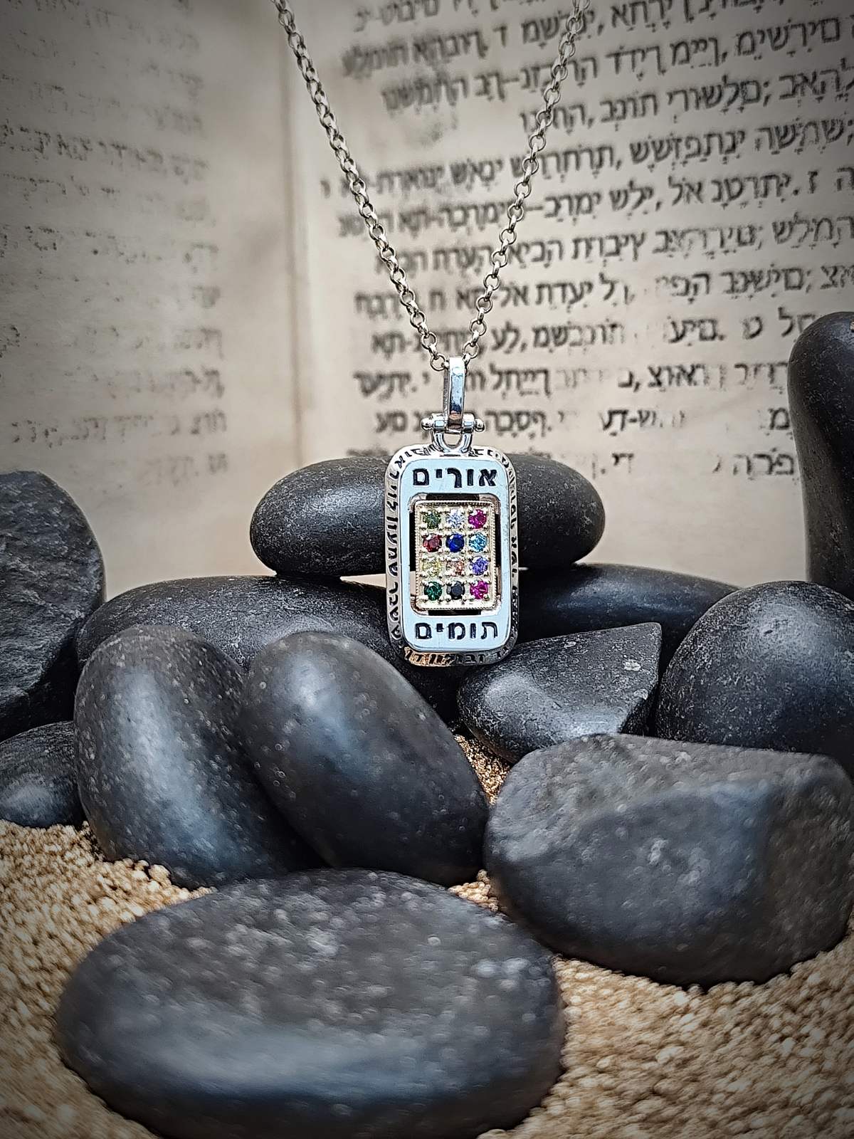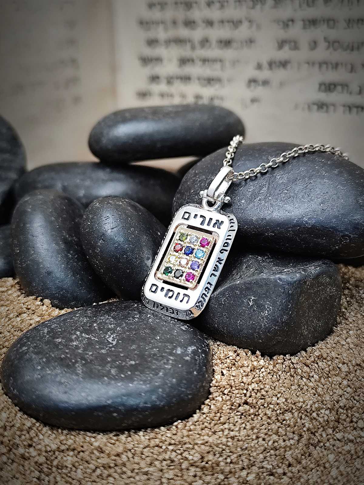 Елегантно и традиционно, това правоъгълно колие “Hoshen” се отличава с гравирана решетка. Състои се от 12 квадрата, всеки от които е вграден с искрящо оцветен камък. Камъните са подредени в цвят, за да съответстват на оригиналния дизайн на “Hoshen”. Кабалистите вярват, че уникалната комбинация от различни камъни притежава специална духовна и енергийна сила. Силата е достатъчно мощна, за да защити носещия го от всякакви духовни и физически злини. Красив и традиционен подарък на някой, когото истински обичате. Този пендант е подходящ за мъж или жена.