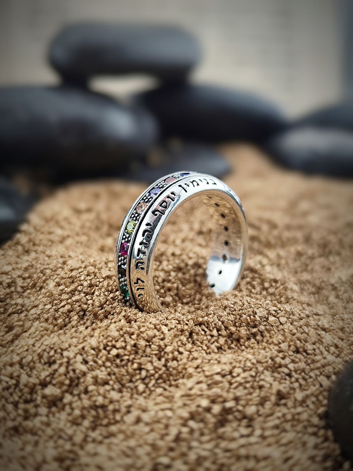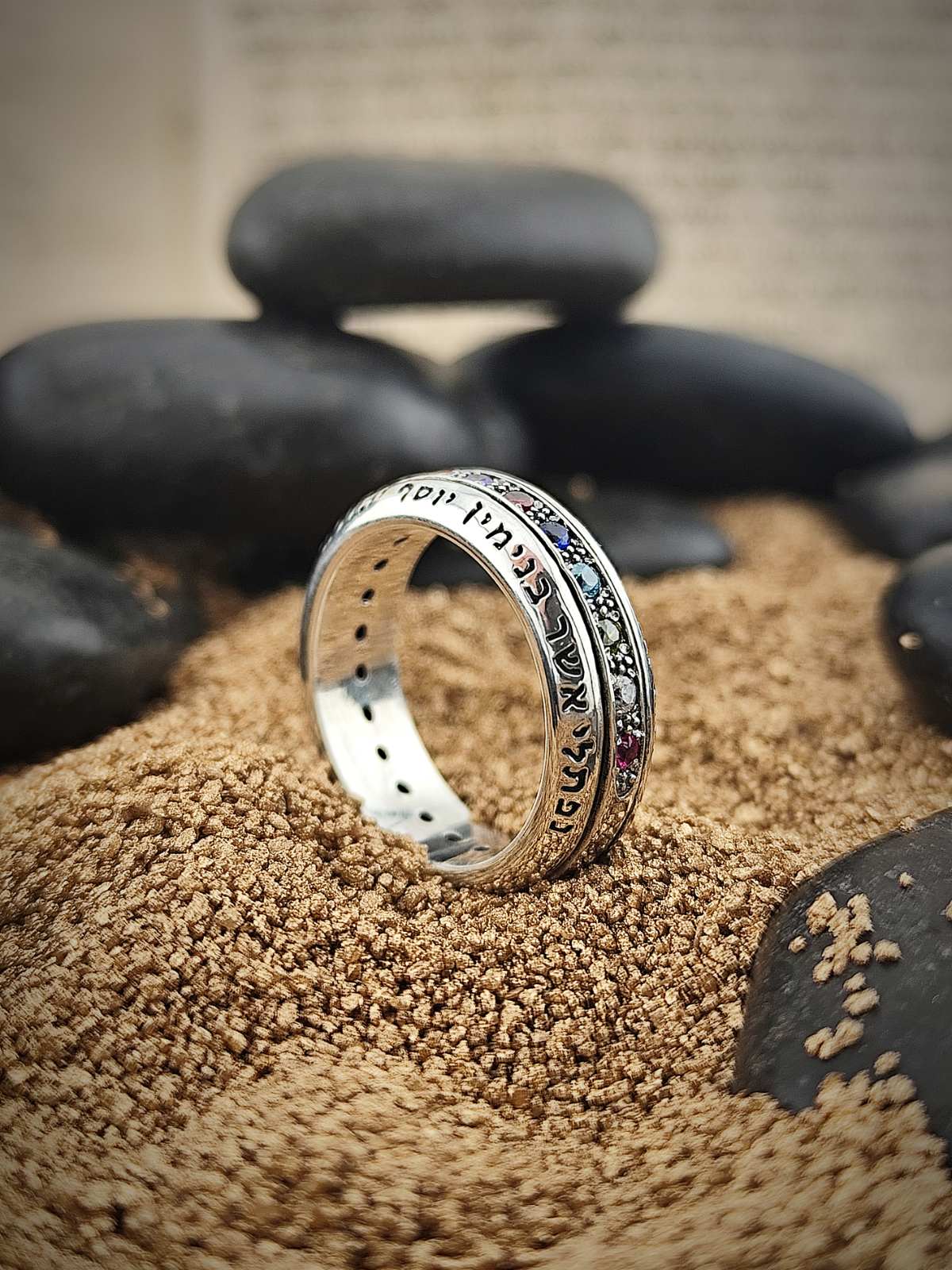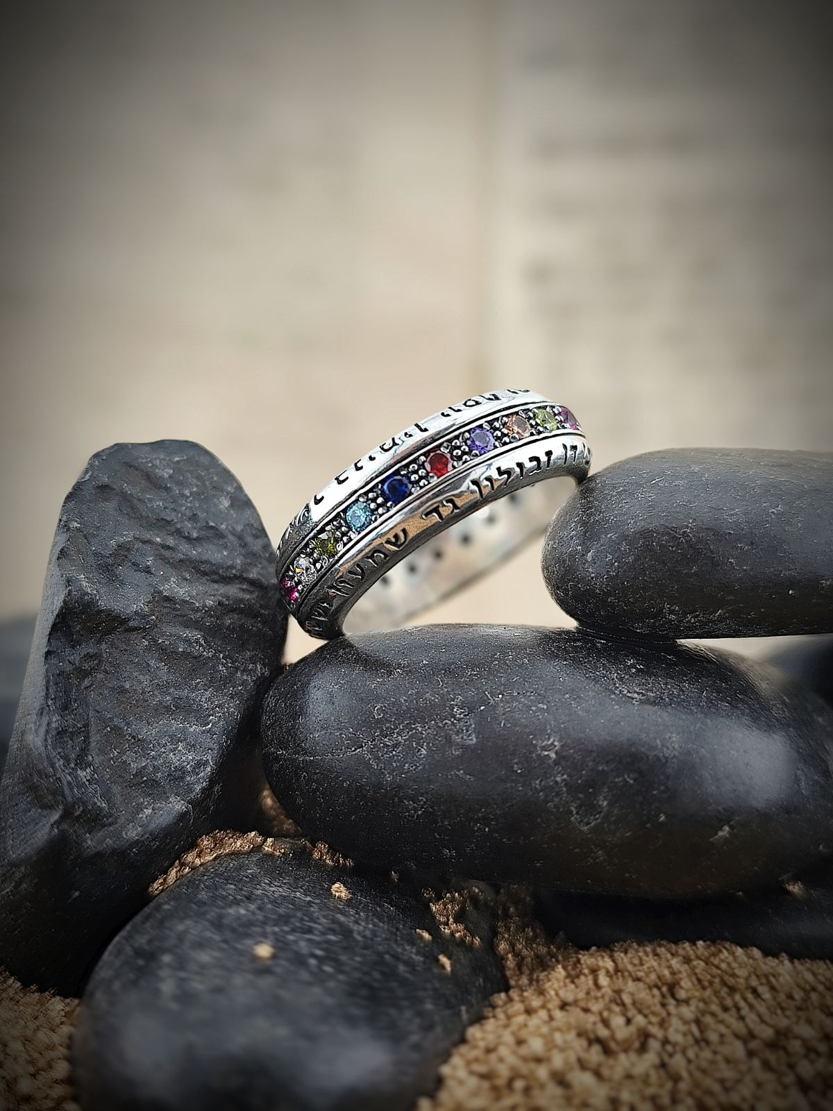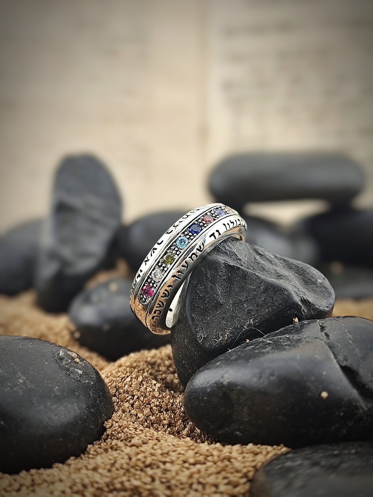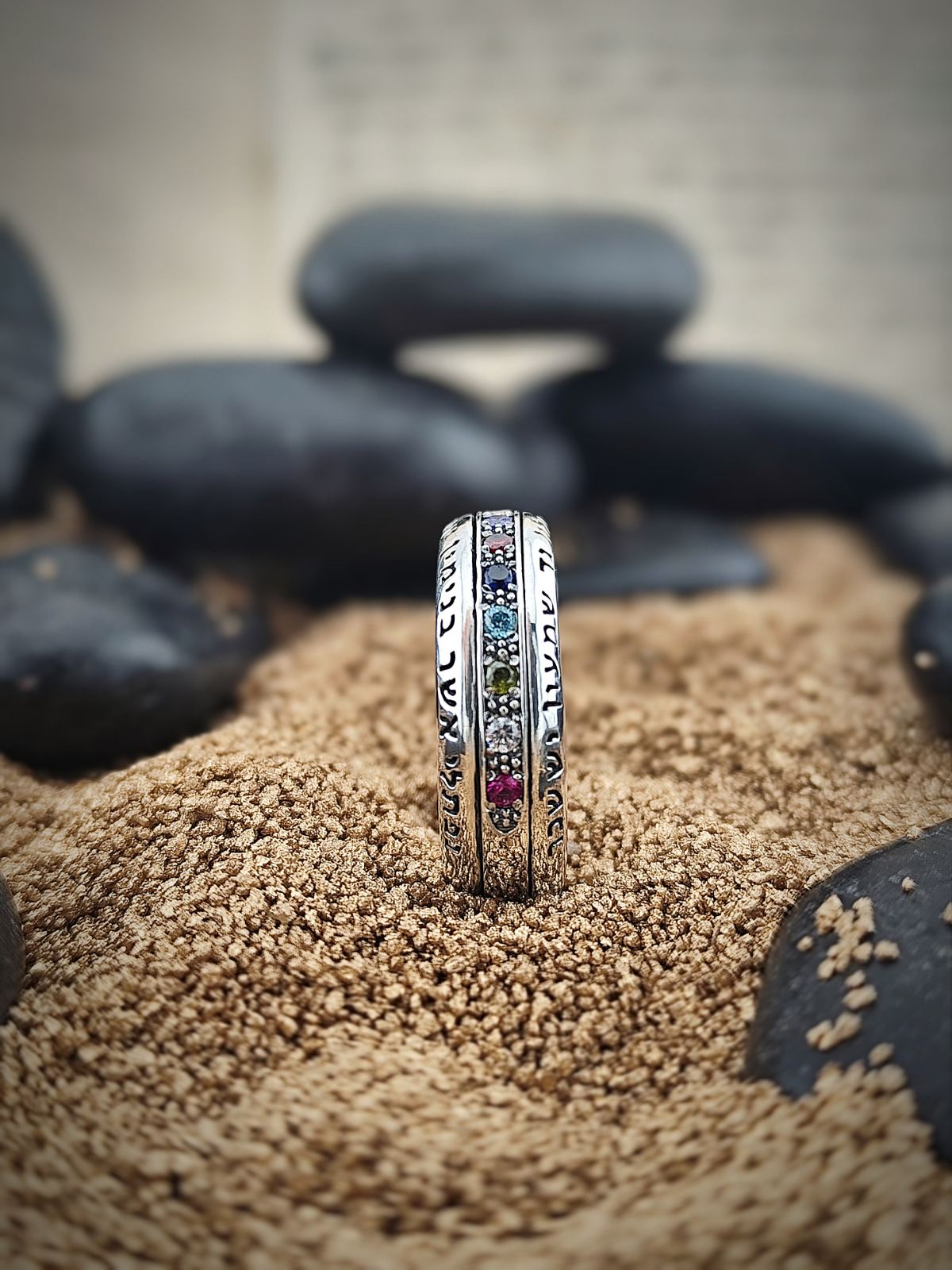 Сребърен пръстен с родиево покритие  в стил “Hoshen” със собствен красив дизайн за да подчертае блясъка на 12-те цветни кристала, символизиращи връзката между амбициите на човека и съвършенството на природата. Модела представлява масивна халка, с въртяща се тънка сребърна лента в центъра с инкрустирани циркони Hoshen, които са дванадесет на брой. 12 е свещеното чисто!