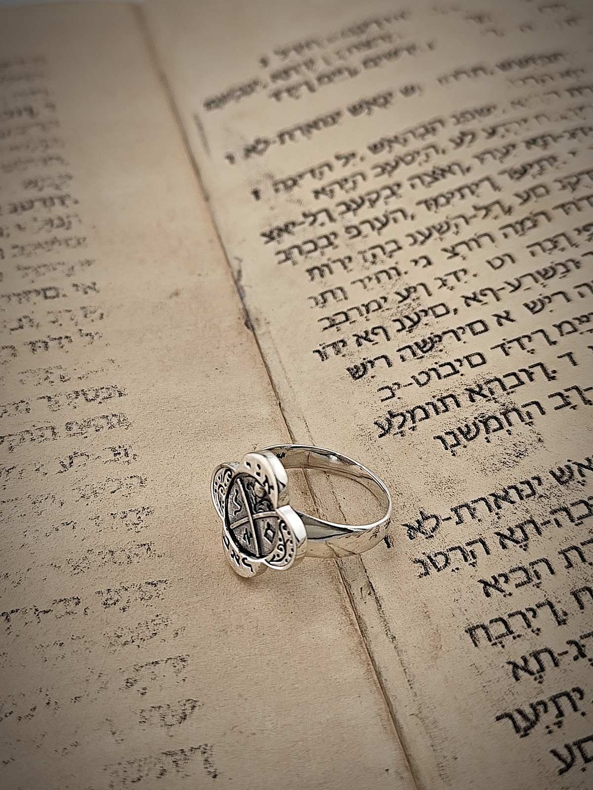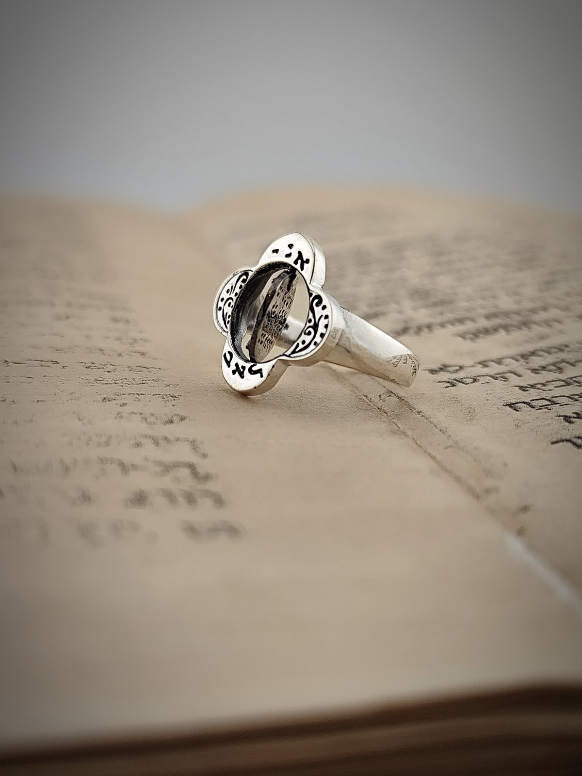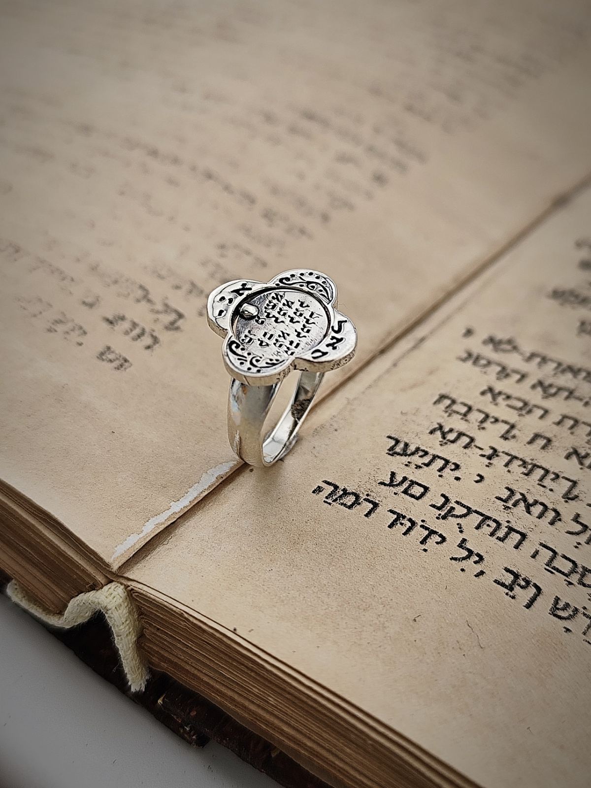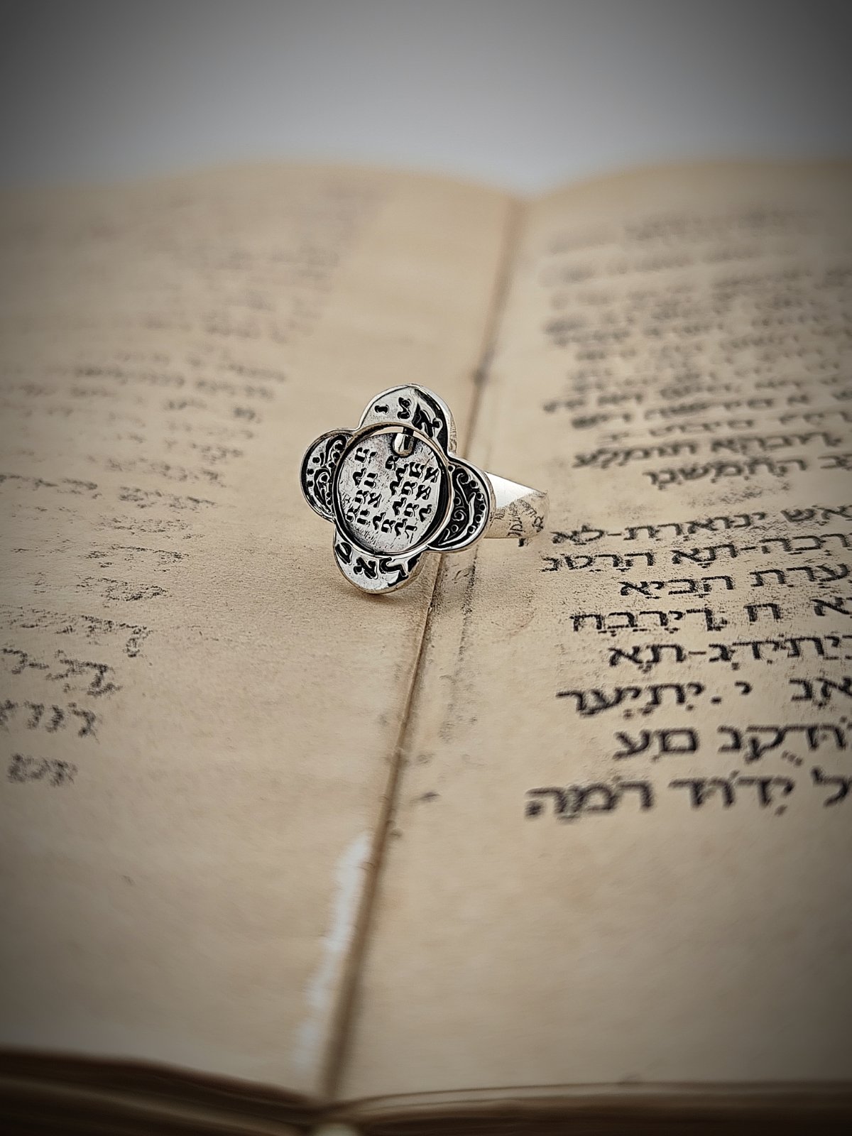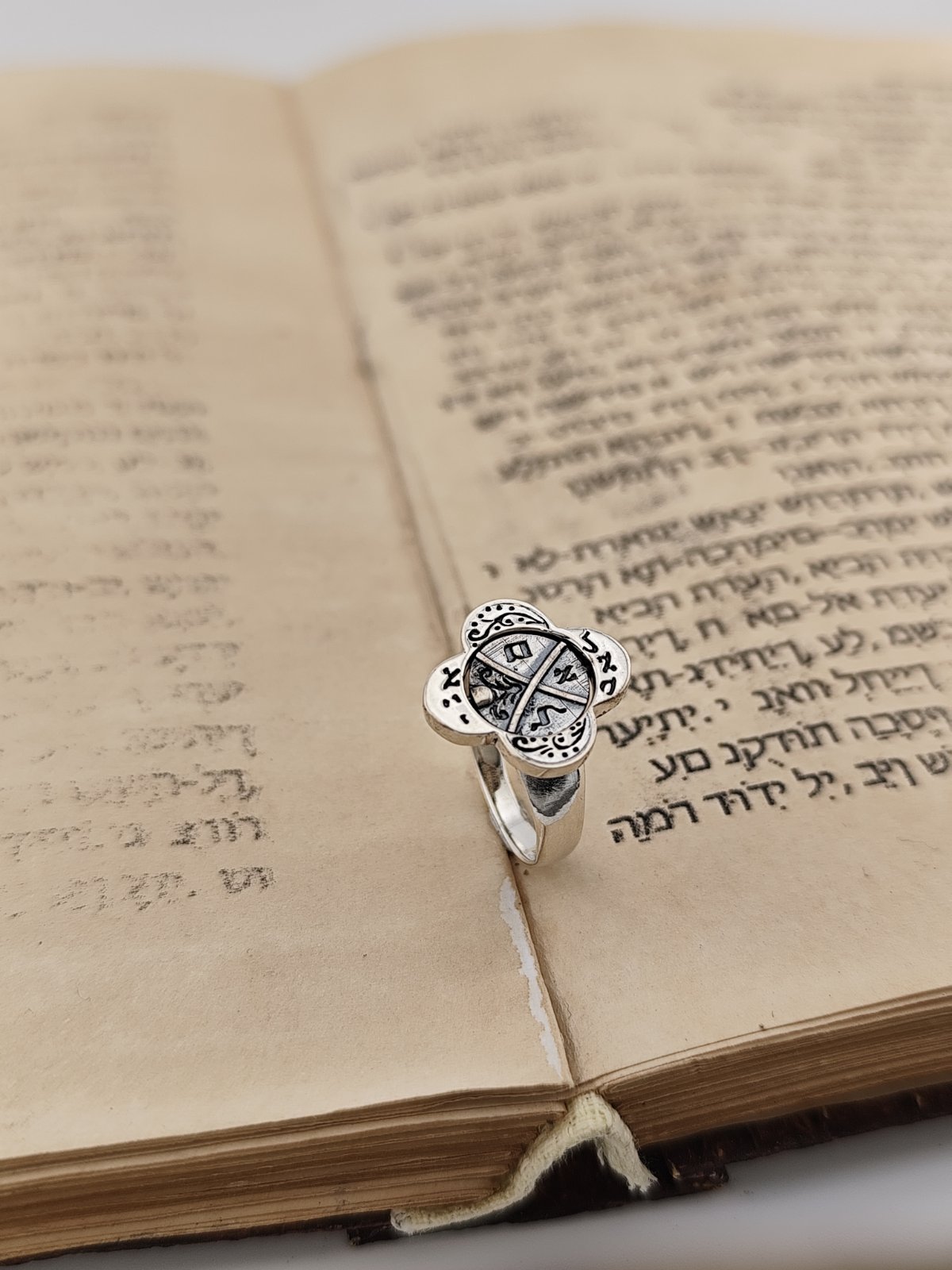 Този амулет се свързва с изобилие, богатство и просперитет. На четирите листчета на детелина, които “пазят” монетата е изписан текста на молитвата “Тикун Клали”. Според великия равин, Нахум от Бреслов, Тикун Клали е мощна молитва за изкупление на греховете, инструмент, който засилва положителните промени както в материалния, така и в духовния свят. За всички ръчно изработени пръстени във фабриката на Студио Николас, се използва високо качествено сребро с проба 925. 4 грама/ 17 мм. диаметър