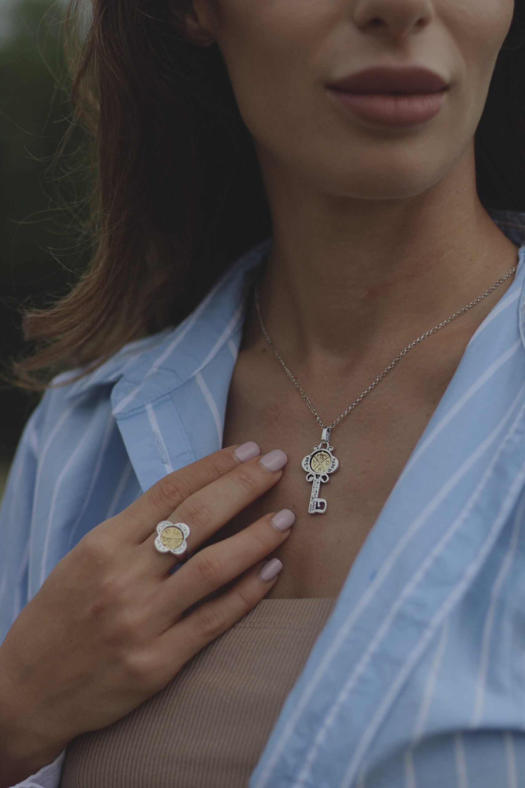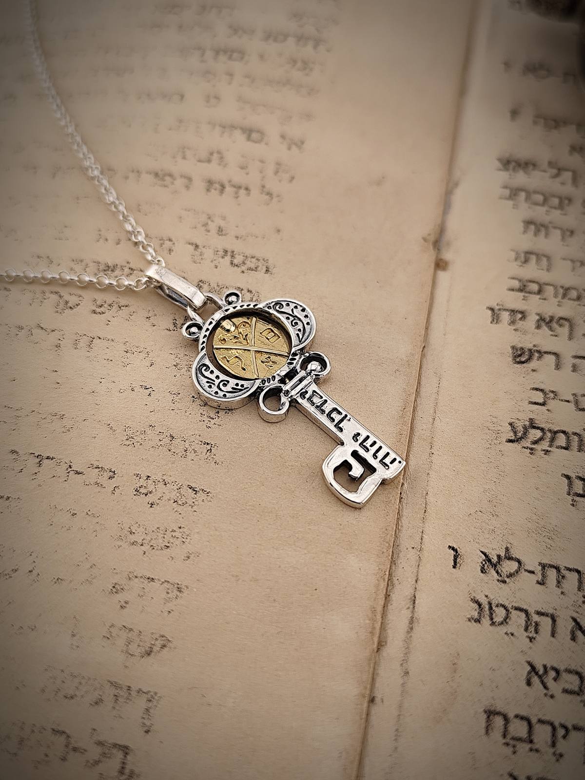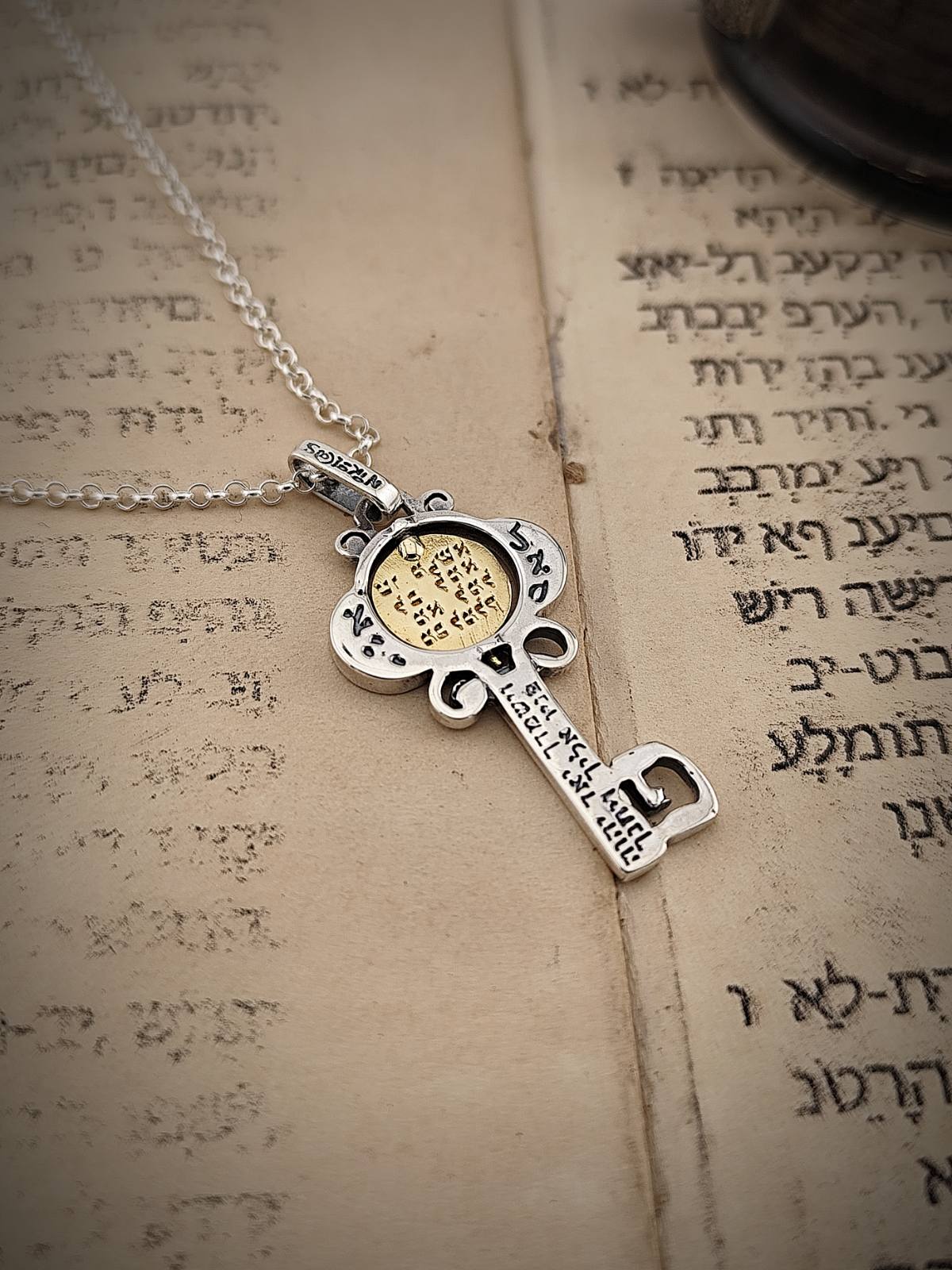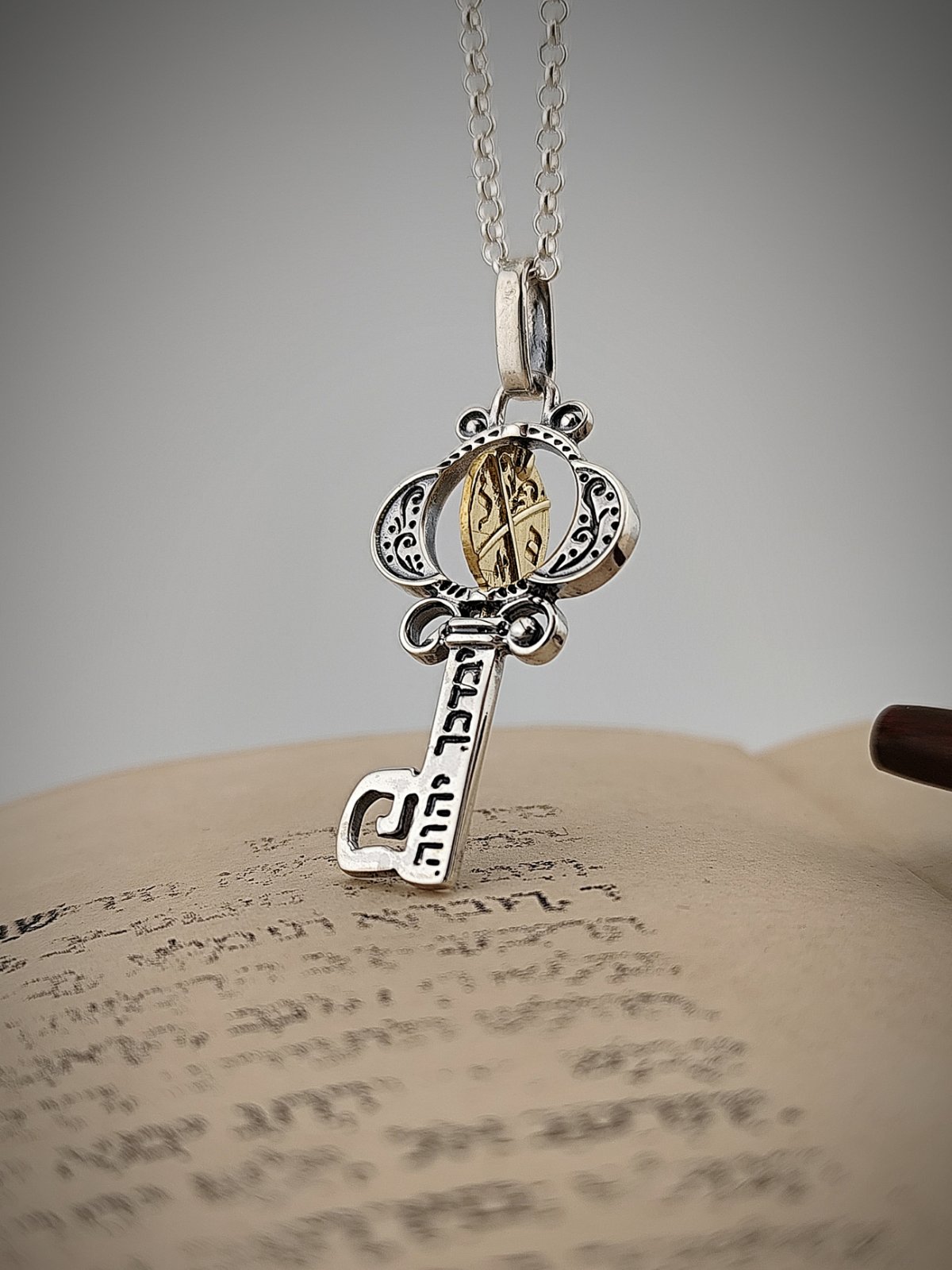 KABBALAH* амулет от сребро с 14к злато “КЛЮЧ за ИЗОБИЛИЕ” с молитвата”Tikun klali”. Сребърен ключ с въртяща се златна монета 14К- гравирана с еврейските букви Samech-Alef-Lamed, което е едно от 72-те имена на Бог. Свързва се с изобилие, богатство и просперитет.