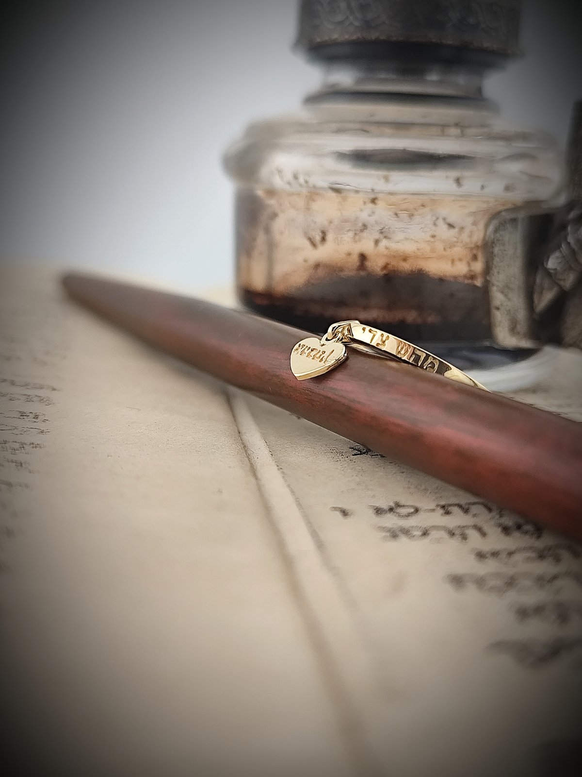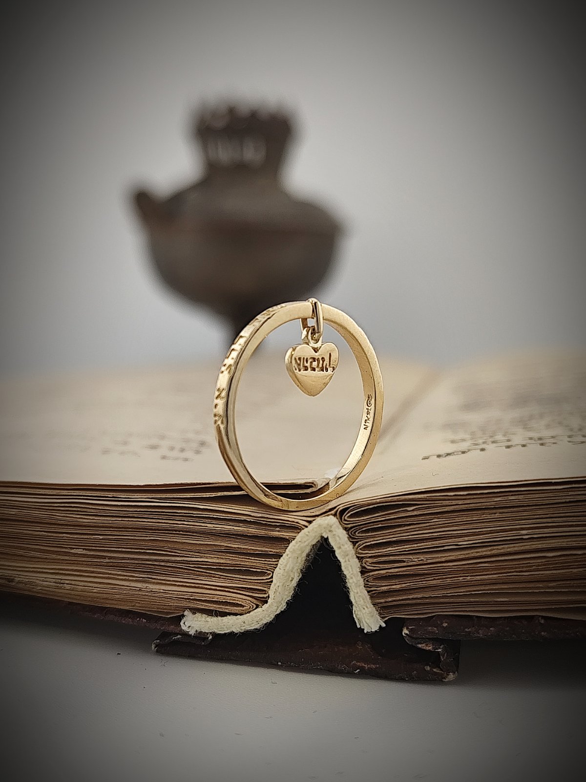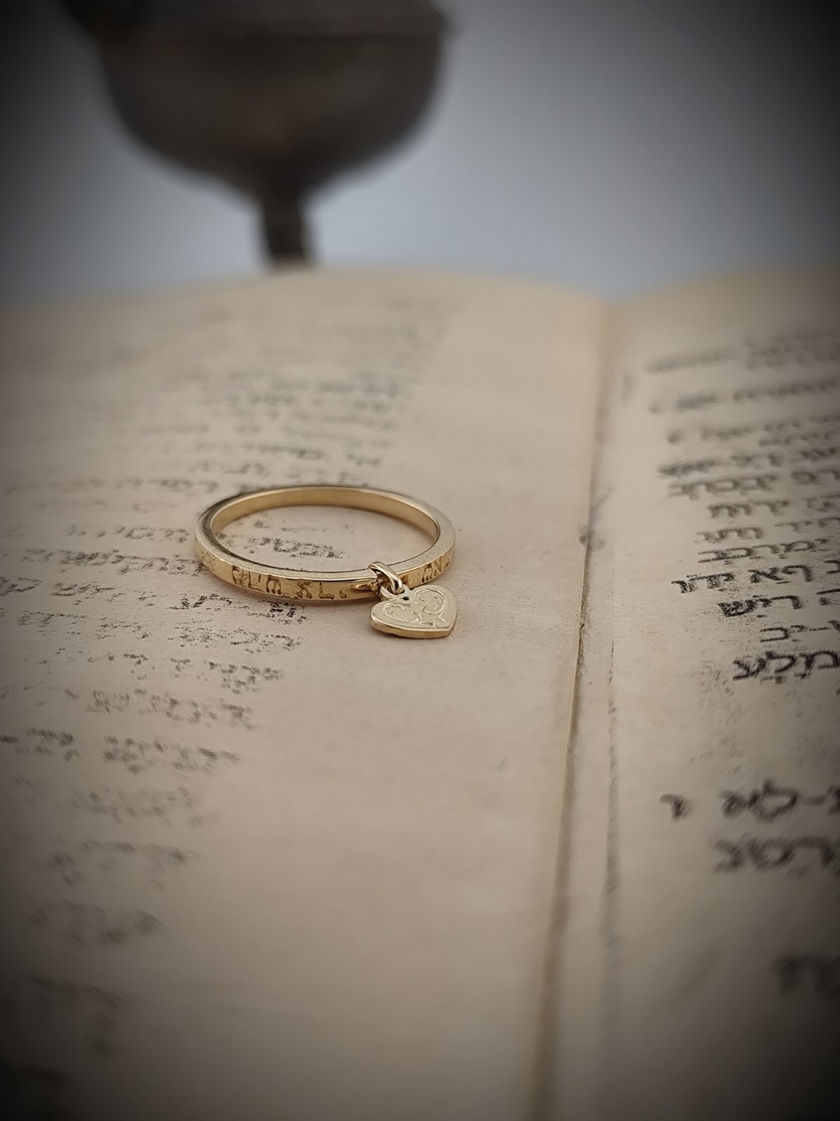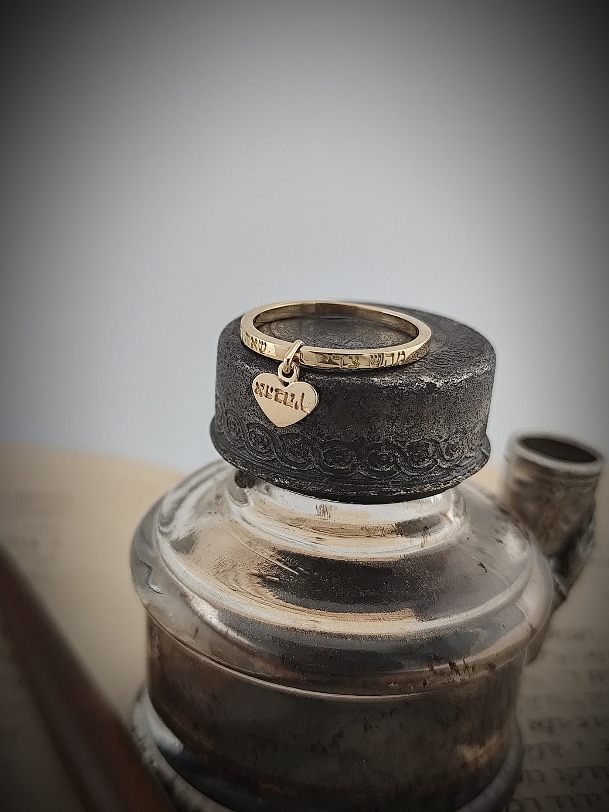 Ръчно изработен от качествено 14 каратово злато с гарантиран произход – този зашеметяващ пръстен е допълнен с нежно сърце, на което е изписана “אהבתיך част от стиха : ואהבת עולם אהבתיך „И любовта на света е твоята любов“ Jeremiah 31.3