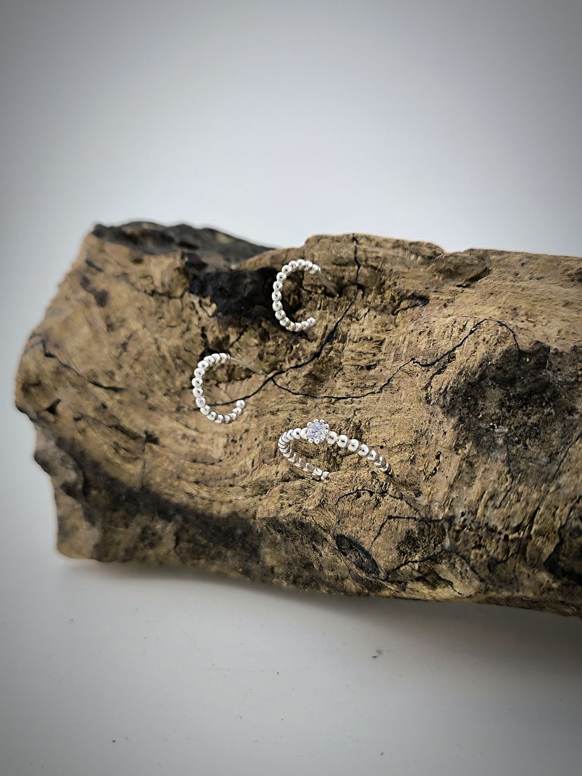 Обеците повтарят тази линия в завършена форма, докато пръстенът я интерпретира по по-интимен начин – като деликатен акцент, който обгръща пръста.