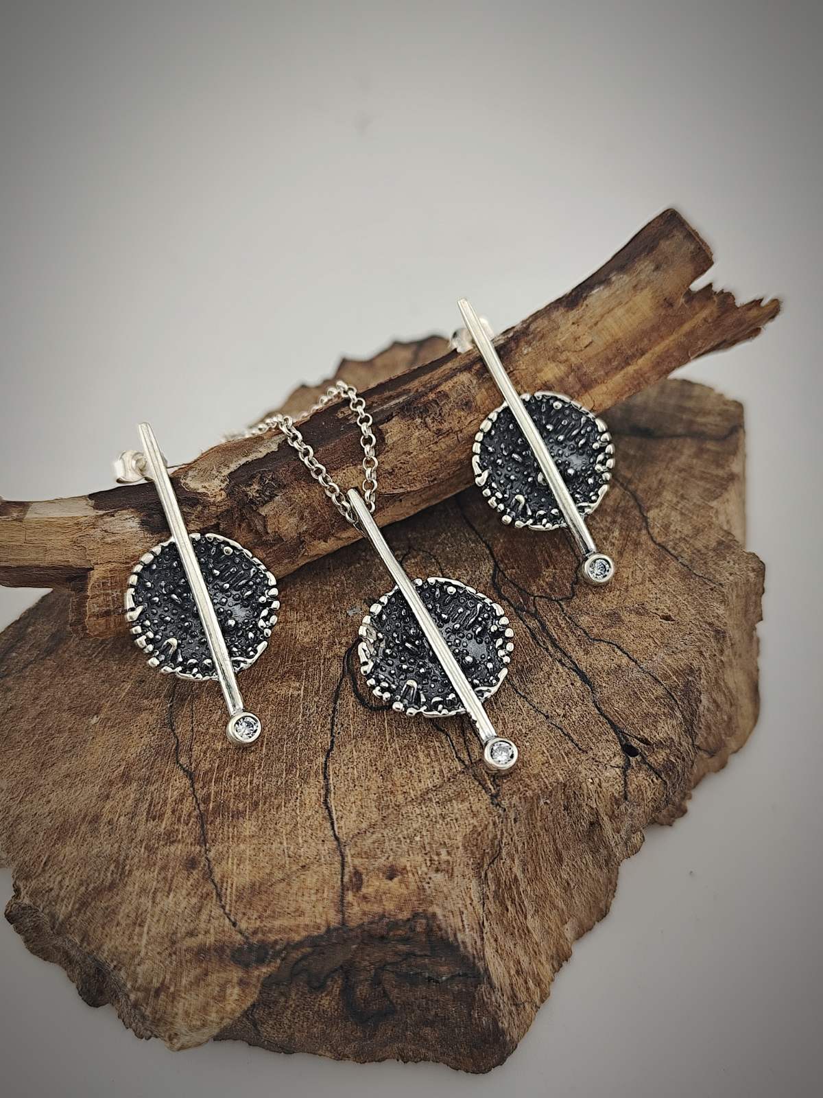 Контрастът между текстурираната повърхност и изчистената вертикална линия създава усещане за движение и посока. Линията преминава през формата като светлинен лъч – ясен и уверен акцент, който придава характер на бижуто. В края ѝ е поставен фин циркон, който улавя светлината и завършва композицията с деликатен блясък.