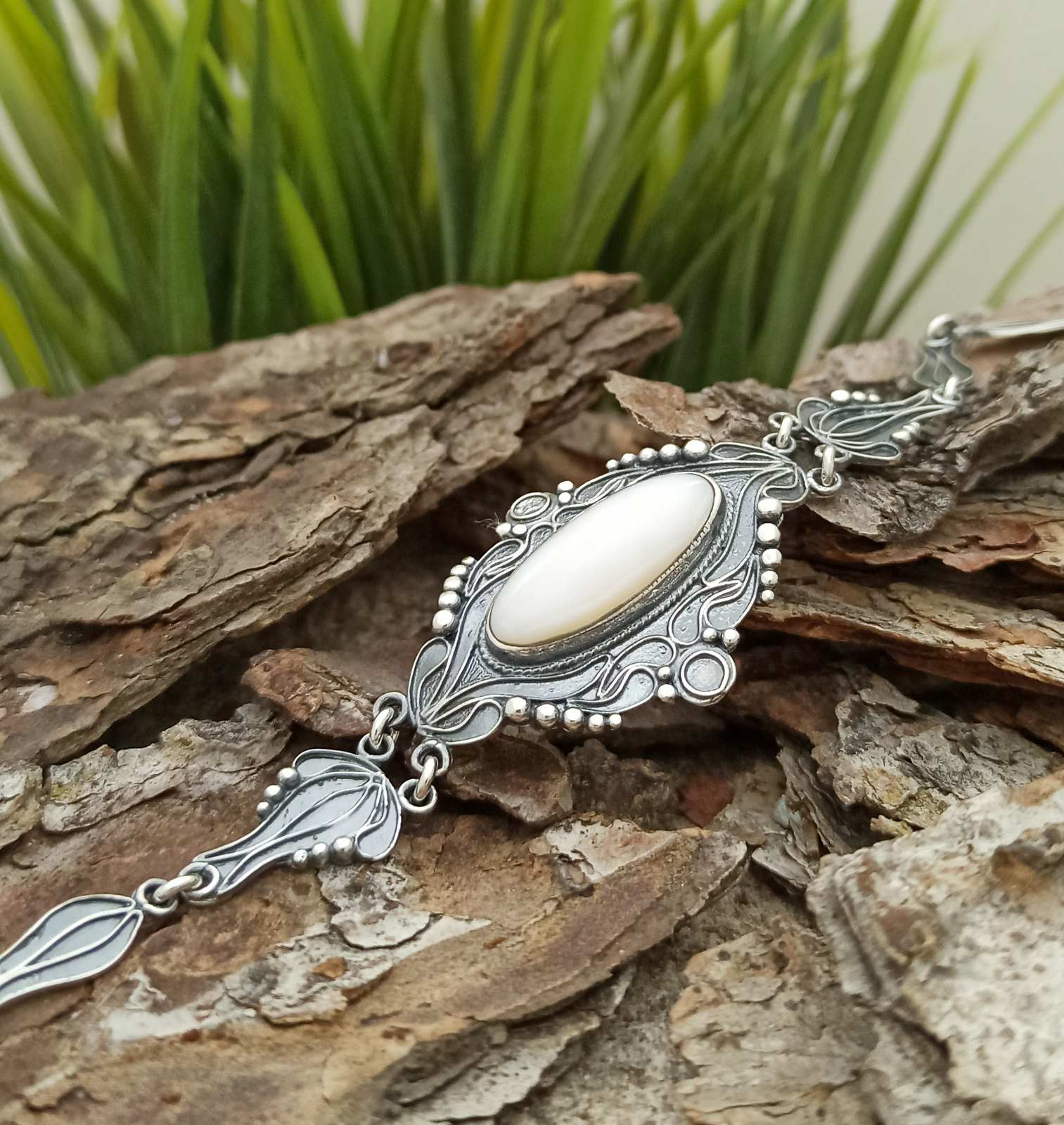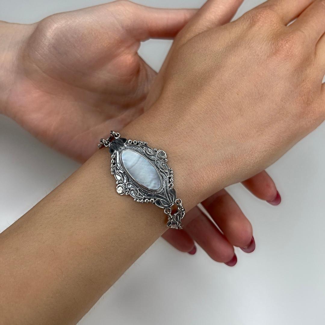 Сребърна гривна „Флор де ла Мар“. Дамска сребърна гривна с бял седеф “Изгубеното съкровище на морското цвете”. Kрасива и стилна, старовремска гривна ръчно произведена от сребро с проба 925 и допълнена с океански абалон. Авторско бижу създадено по модел на Студио Николас, най-голямата фабрика за сребърни накити на Балканите! Дължина на основния елемент 37мм./ широчина: 26мм. „Флор де ла Мар“ или „Флор ду Мар“ (на португалски: Flor de la Mar, Flor do Mar – „Цвете на морето“) е португалски ветроходен кораб от ХVІ век. В продължение на 9 години взима активно участие в ключови исторически събития в Индийския океан. На нея плава Афонсу де Албукерке.