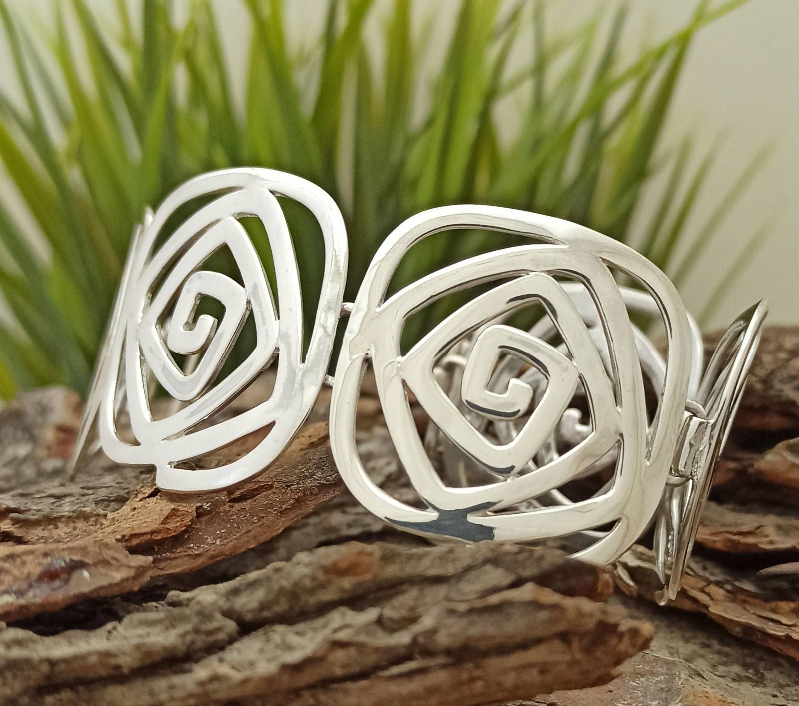 Дамска сребърна гривна, съставена от масивни елементи, които красиво обгръщат ръката, на своята притежателка. Ръчна изработка, модел 417B – Студио Николас.