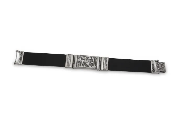 Мъжка сребърна гривна 803B на сребърни бижута Студио Николас. Изработка – кожена каишка, масивна сребърна плочка украсена с митичен образ и ефектна сребърна закопчалка. Ръчна изработка, 925 проба, сребърна красота! СЕРТИФИКАТ ЗА АВТЕНТИЧНОСТ. Мъжете могат да носят различни видове сребърни бижута. Разнообразието включва: