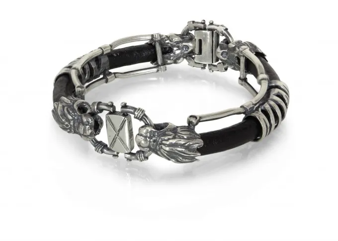 Мъжка сребърна гривна с естествена кожа. Прецизно изработена мъжка гривна модел 446B четири глави на змей, създадени от стерлингово сребро поставени на основа от естествена кожа., фиксирана с масивна сребърна закопчалка. Nikol@s е изкуството, с внимание към всеки детайл. Ръчна изработка, 925 проба, сребърна красота! СЕРТИФИКАТ ЗА АВТЕНТИЧНОСТ