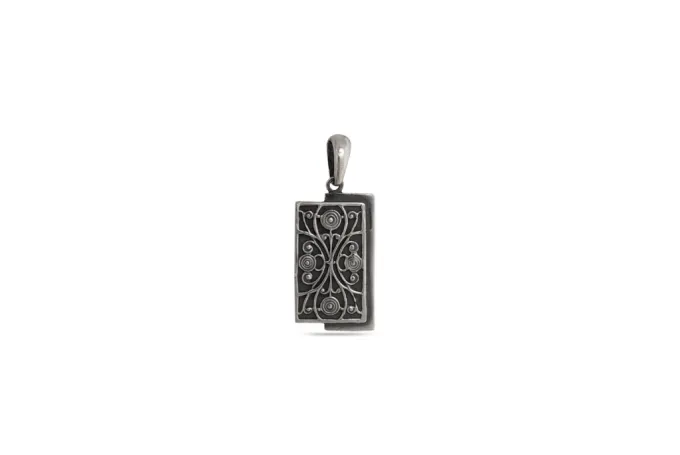 Дамски сребърен медальон “Филигран” 1153M от Студио Николас. Български производител на сребърна бижутерия за мъже и жени. Комплект с  пръстен, медальон и обеци. Патентовани бижута от Sterling silver 925! Nikol@s е изкуството, с внимание към всеки детайл. Ръчна изработка, 925 проба, сребърна красота! Филигранът е изкуството да се правят украси и орнаменти чрез извиване на много тънки метални нишки или ленти, които се поставят върху повърхността на хартия, кожа или друг материал. Тези украси могат да бъдат изработени в различни форми и могат да бъдат използвани за да се придаде по-голяма красота и елегантност на даден обект или документ. Филигранът е често използван в изработката на декоративни кутии, картички, ръчно изработени книги, марки, грамоти и други подобни. Комбинирайте вашият Дамски сребърен медальон “Филигран” със сребърна гривна “Филигран”.