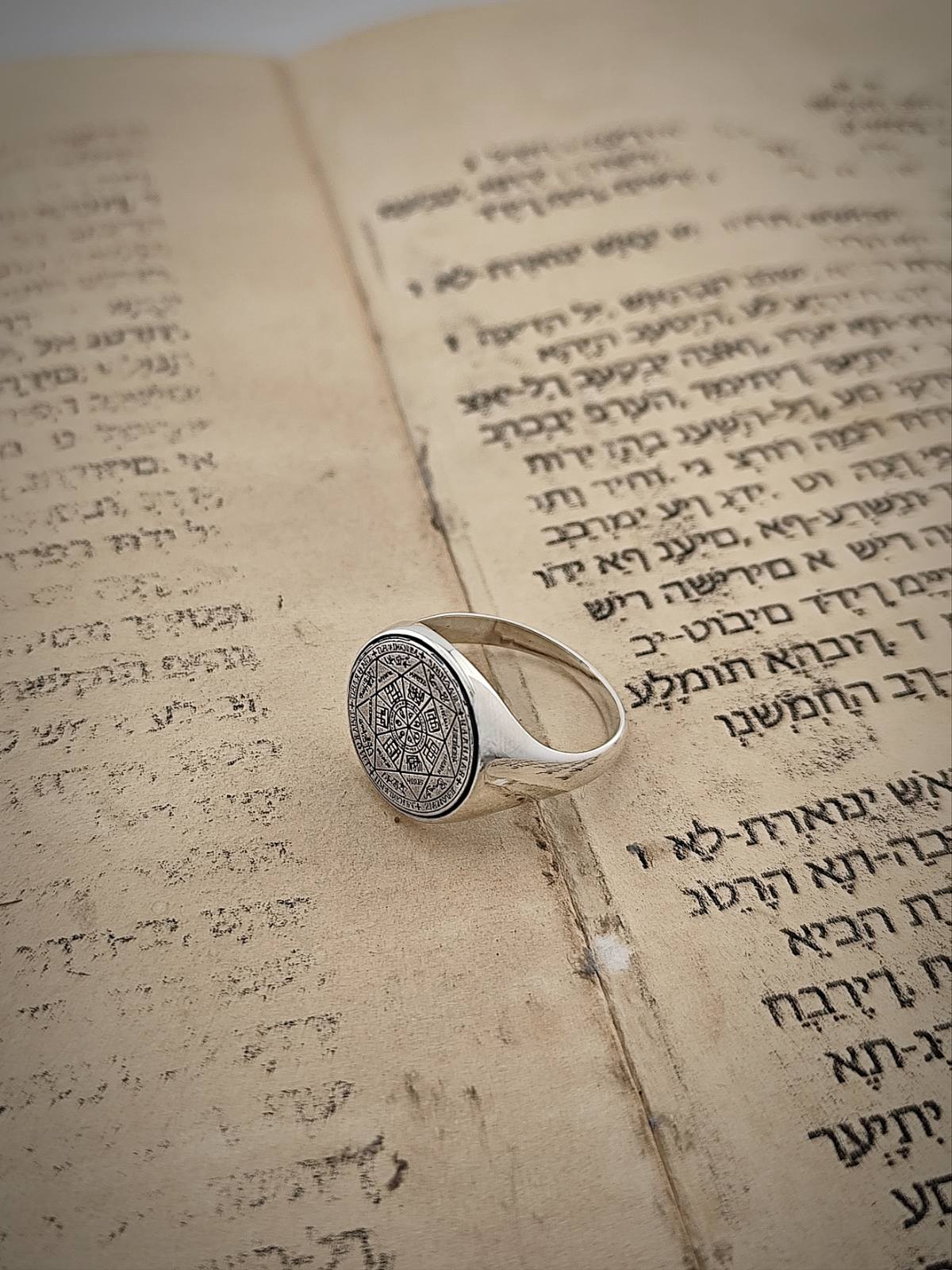Лицевата част на пръстена е украсена с детайлно гравиран Печат на Седемте Архангела — кръгла композиция със сакрални знаци и надписи, подредени в хармонична геометрия. Патината подчертава дълбочината на линиите и създава контраст между релефа и сребърната основа. Корпусът на пръстена е гладък и масивен, с плавен преход към лицевата част — израз на сила и стабилност.
