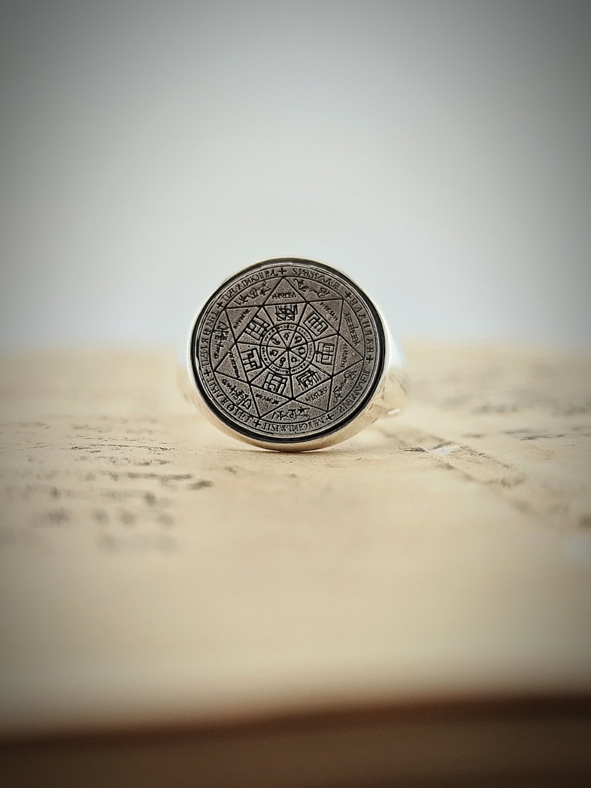 Пръстенът е изработен ръчно от стерлингово сребро 925, с автентична маркировка и проба. Върху релефната повърхност е нанесена патина, която подсилва усещането за древност и символна дълбочина. Всеки детайл е изрязан с прецизност, за да се запази свещената геометрия на печата.