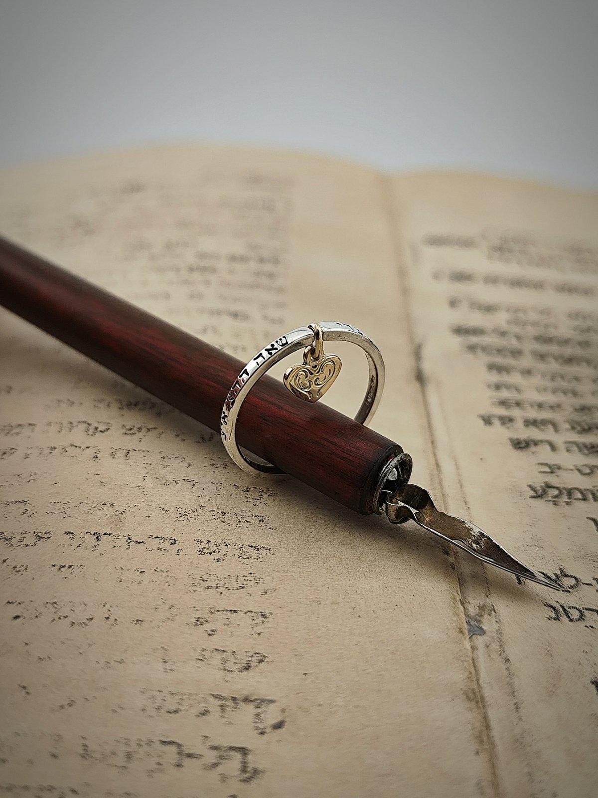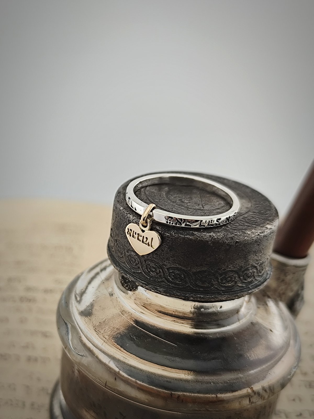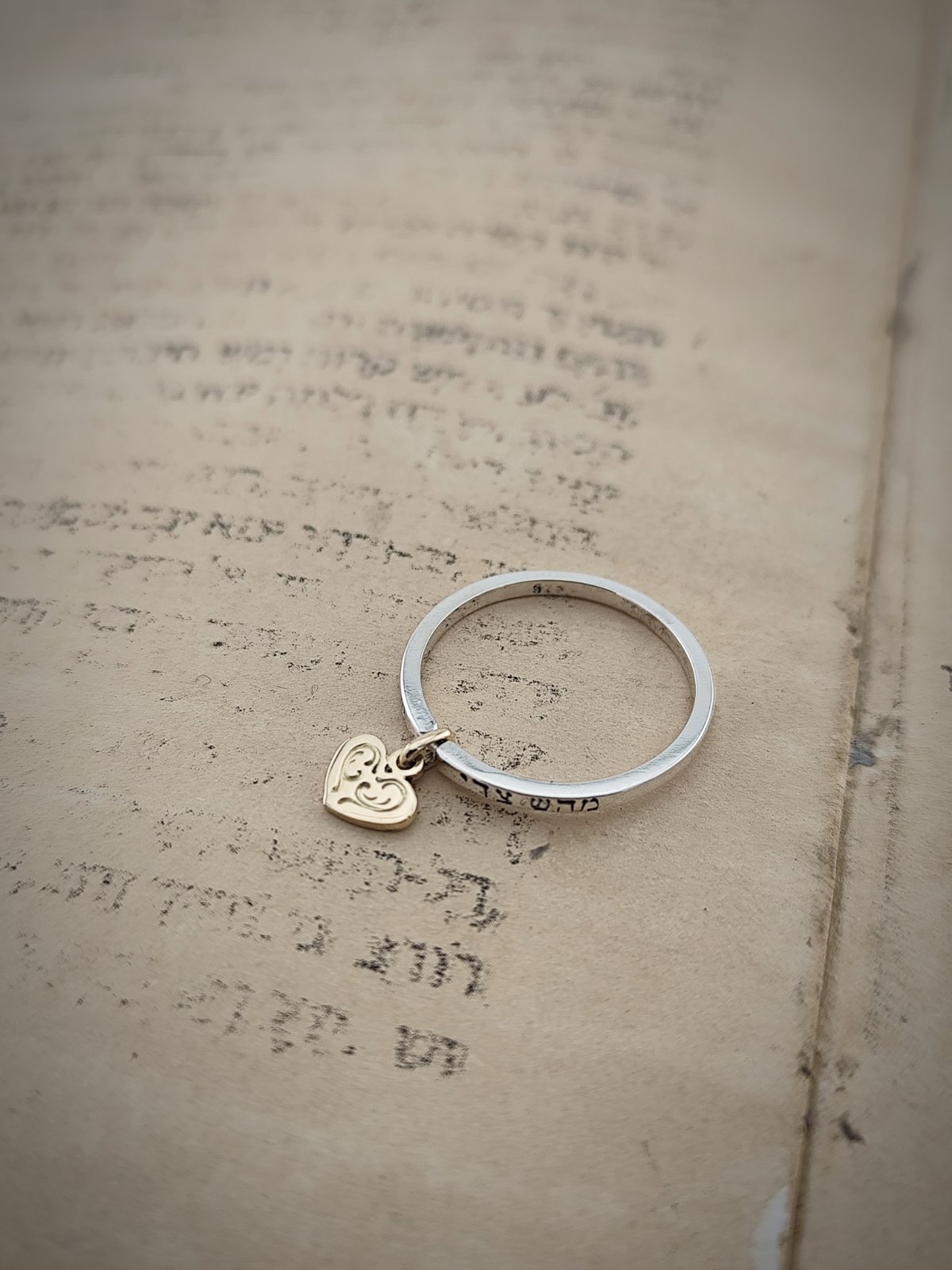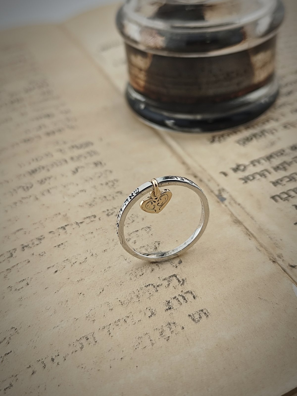 Ръчно изработен в комбинация от стерлингово сребро 925 и 14 каратово злато – този зашеметяващ пръстен е допълнен със сърце, на което е изписана “אהבתיך част от стиха : ואהבת עולם אהבתיך „И любовта на света е твоята любов“ Jeremiah 31.3