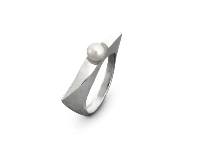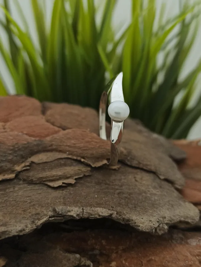 Сребърен пръстен с изчистен дизайн с инкрустирана речна перла модел 138R на Студио Николас. широчина на пръстена 2,3 см/големина на перлата 0,7 см в диаметър.
