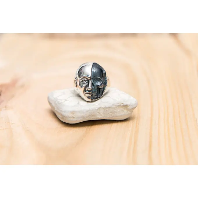 Сребърен пръстен с череп “ДВУЛИКИЯТ”. Ръчно изработен сребърен пръстен с череп “ДВУЛИКИЯТ “ 1301R Студио Николас, мъжки пръстен с маска на лице. Пръстен сребро със сертификат за качество – прекрасен подарък на мъж! Уникална колекция от сребърни бижута създадена за мъже! пръстен с череп; СЕРТИФИКАТ ЗА АВТЕНИЧНОСТ