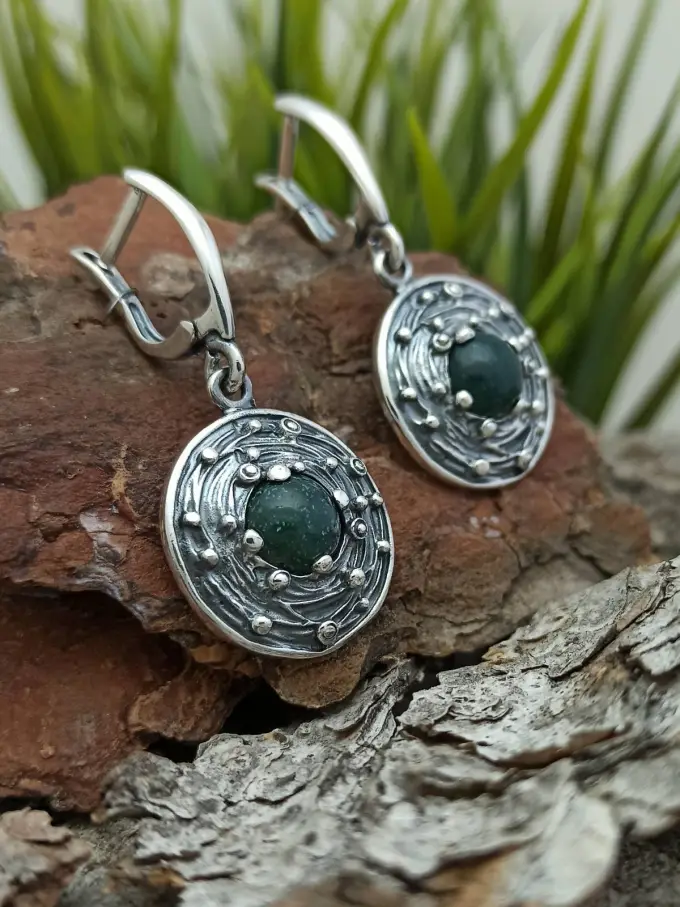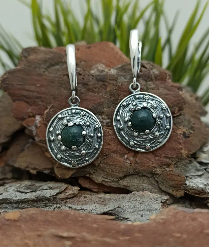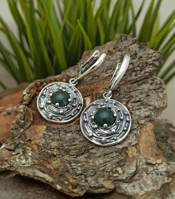 Сребърни обеци с мъхов ахат 1269E. Ръчно изработени кръгли дамски сребърни обеци изработени от оксидирано сребро с проба 925/ Sterling Silver и мъхов ахат. Висящи обици от сребро с мъхов ахат модел на Студио Николас с английско закопчаване. Изберете камъка за Вашето Бижу: авантюрин; лазурит; аметист; кехлибар; лабрадорит; малахит; розов кварц; тюркоаз; мъхов ахат;