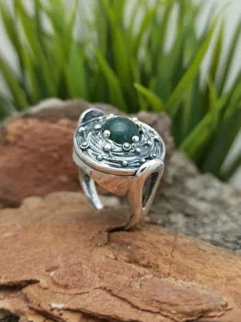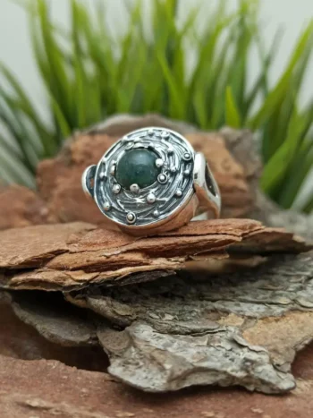 Ръчно изработени кръгли дамски сребърни обеци – оксидирано сребро с проба 925, Sterling Silver и мъхов ахат.