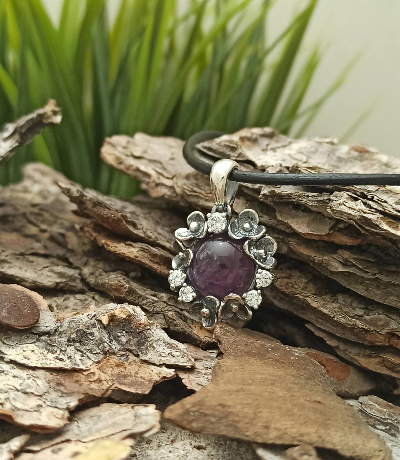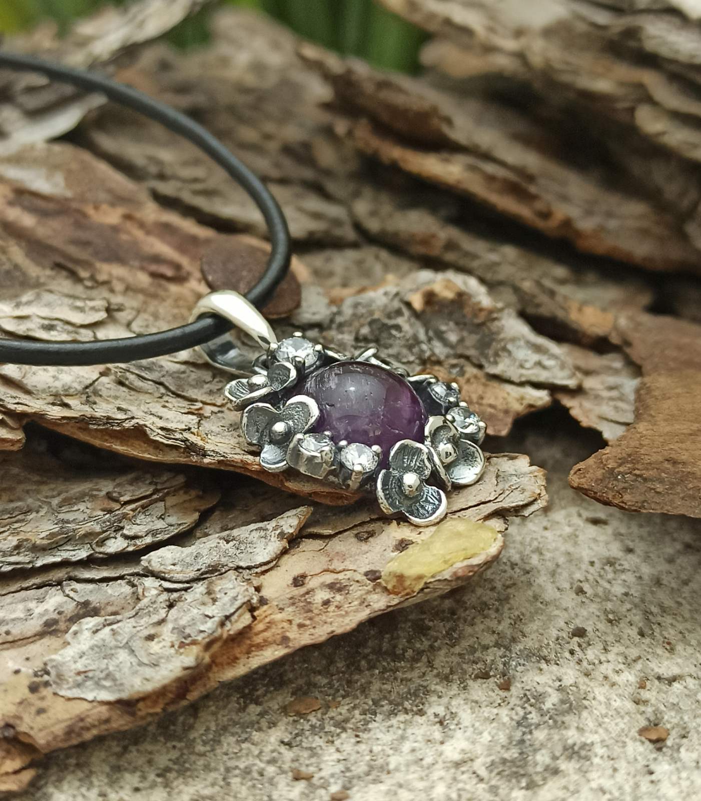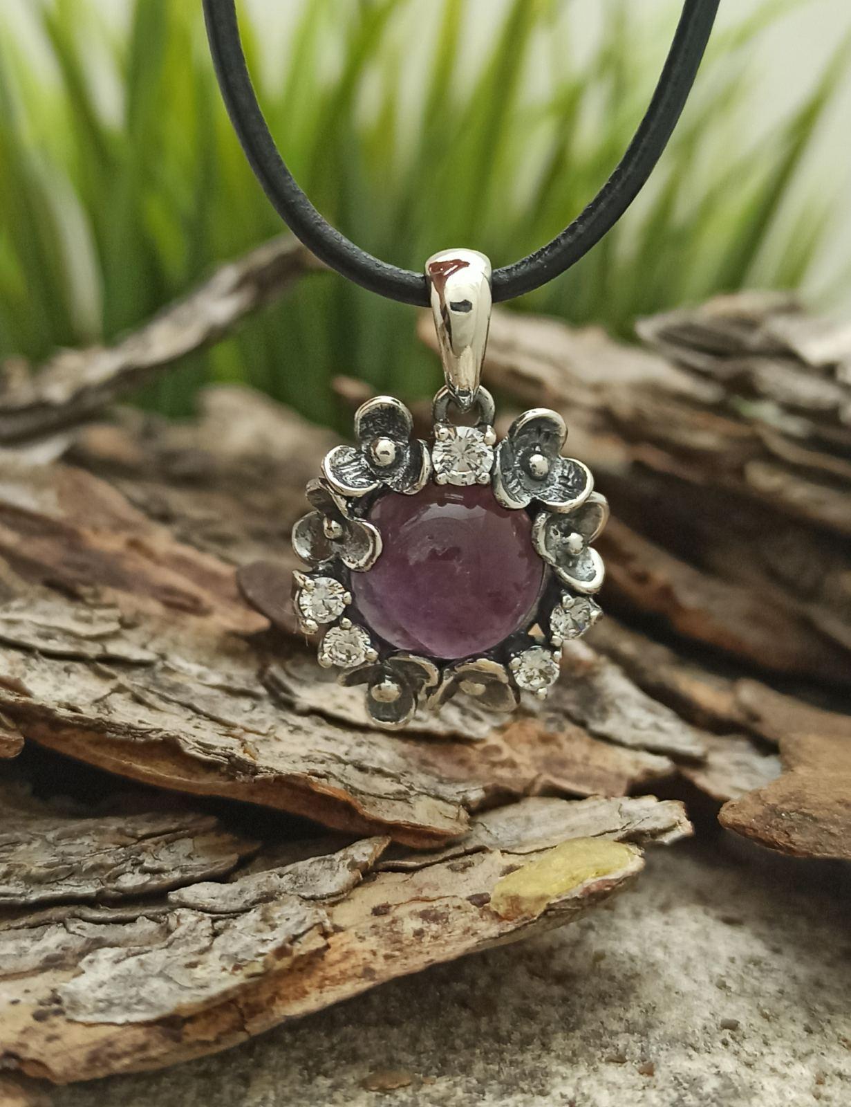 Сребърен медальон с аметист 1093M. Ръчна изработка, 925 пробa, сребърна красота! Комплект с обеци и пръстен от Студио Николас.