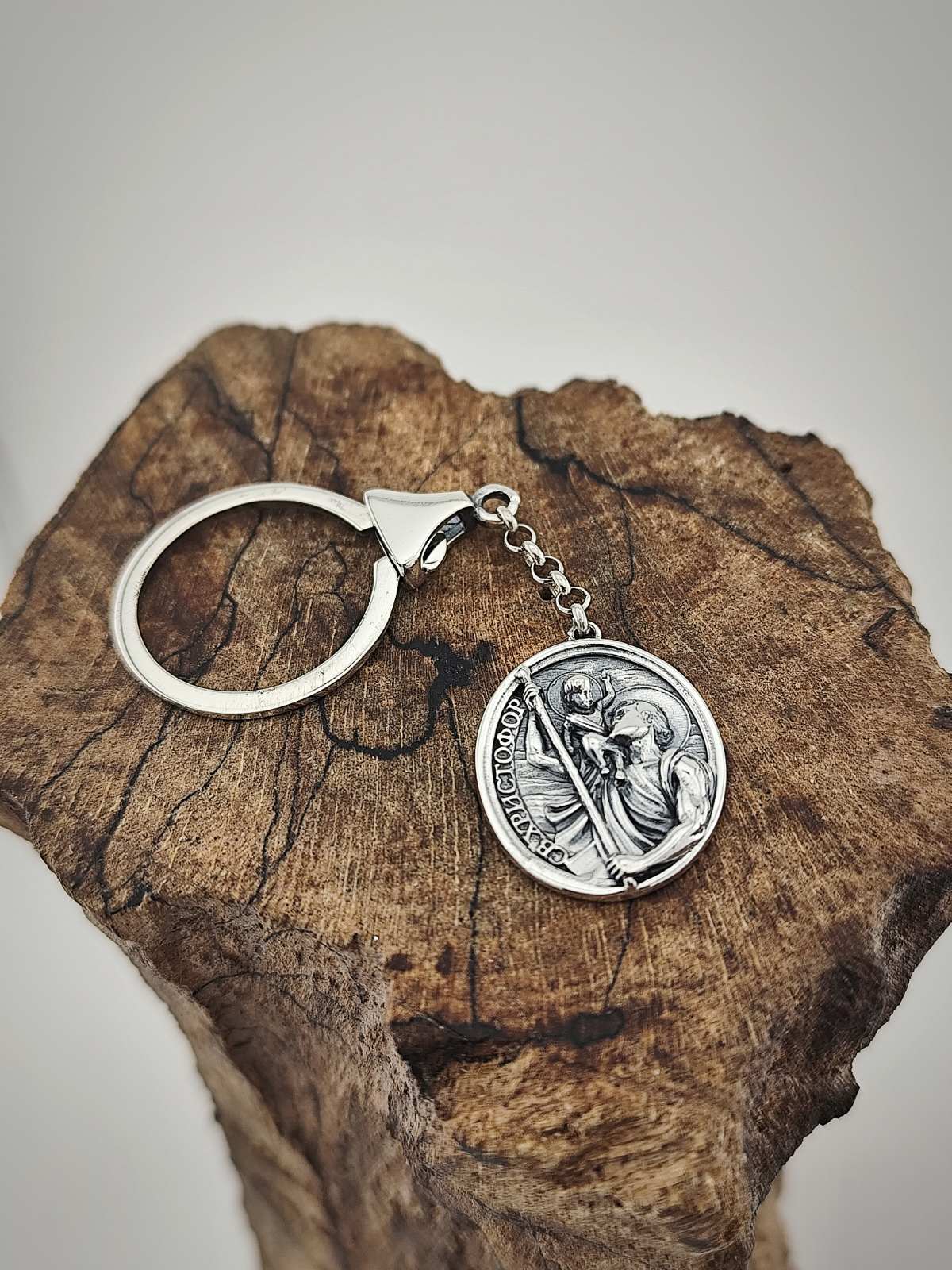 Сребърен ключодържател “Свети Христофор” от бижутерия Студио Николас. Ключодържателят е малък сребърен аксесоар, който служи за улеснена употреба на ключове. Състои се от халка и прикрепен за нея елемент, изработен от сребро 925. Дължината на ключодържателя, посредством сребърната верига позволява връзката ключове да се използва по-лесно, отколкото ако ключовете са свързани директно само с халката.