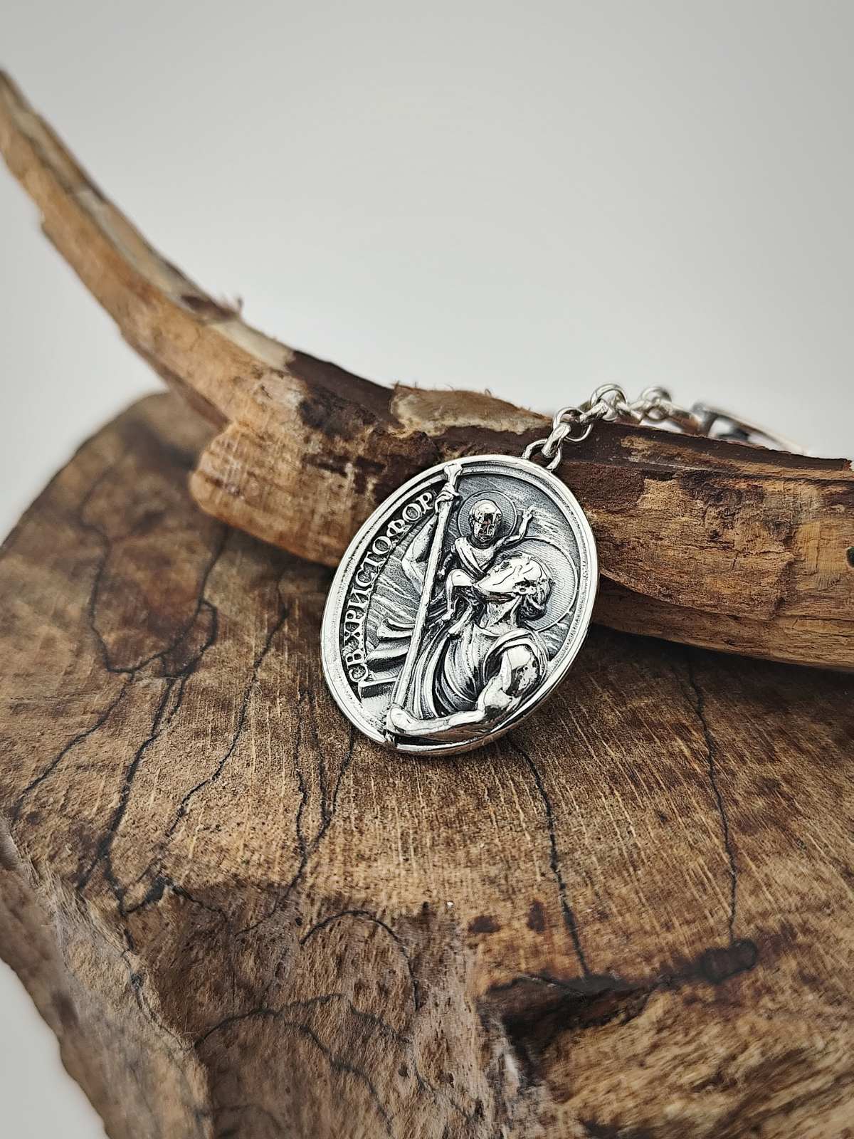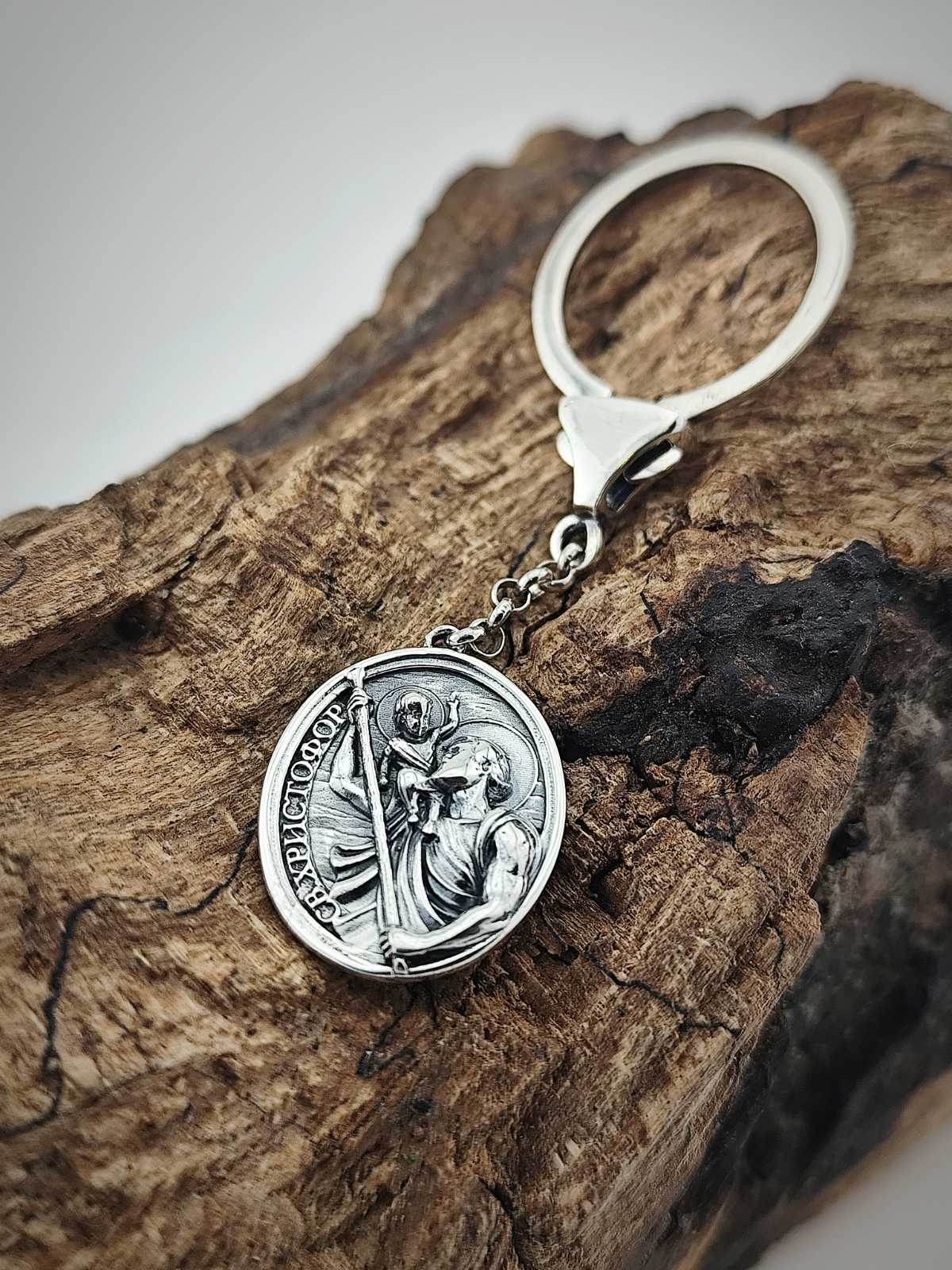 Сребърен ключодържател “Свети Христофор” има изображение, което показва светеца насред река и носещ самия Христос на рамото си. Този нетрадиционен образ идва от една легенда свързана с житието на Христофор (от гръцки /Christo-phoros/ означава „носещия Христос”). Той е бил великан – висок и много силен, и заради това си търсел господар, на който да служи с тази си сила. Никъде обаче не намирал такъв. Един ден отишъл на брега на опасна река и започнал да пренася хората от единия на другия бряг. Сред преминаващите се оказало и едно малко момче, но когато Христофор го вдигнал, установил, че детето тежало повече от всички преди него. Учуден, той го попитал защо тежи толкова много, а то му отговорило, че носи товарът на целия свят на плещите си. Детето било малкият Иисус Христос. Така Христофор намерил най-сетне своя цар на който истински да служи.
