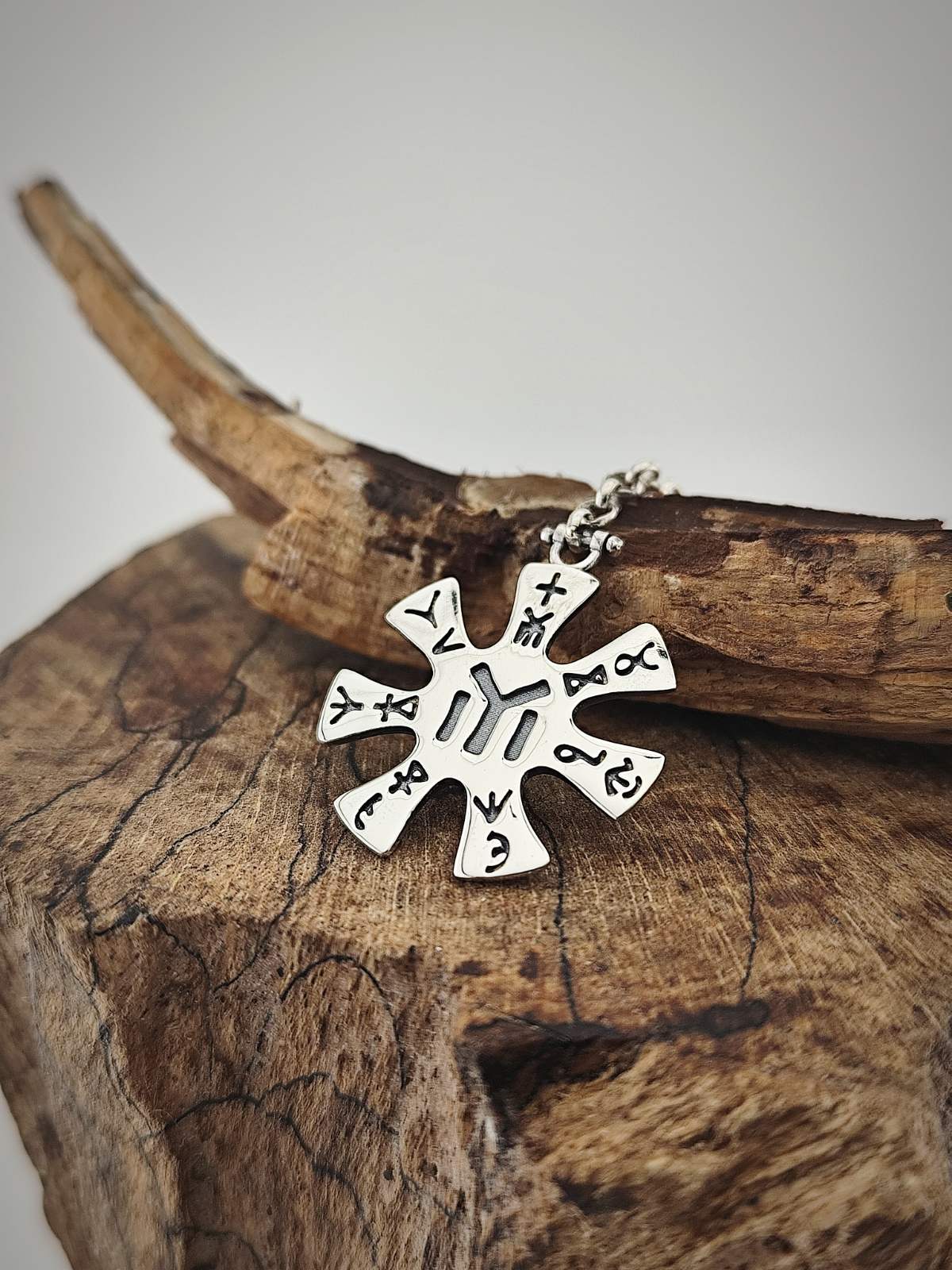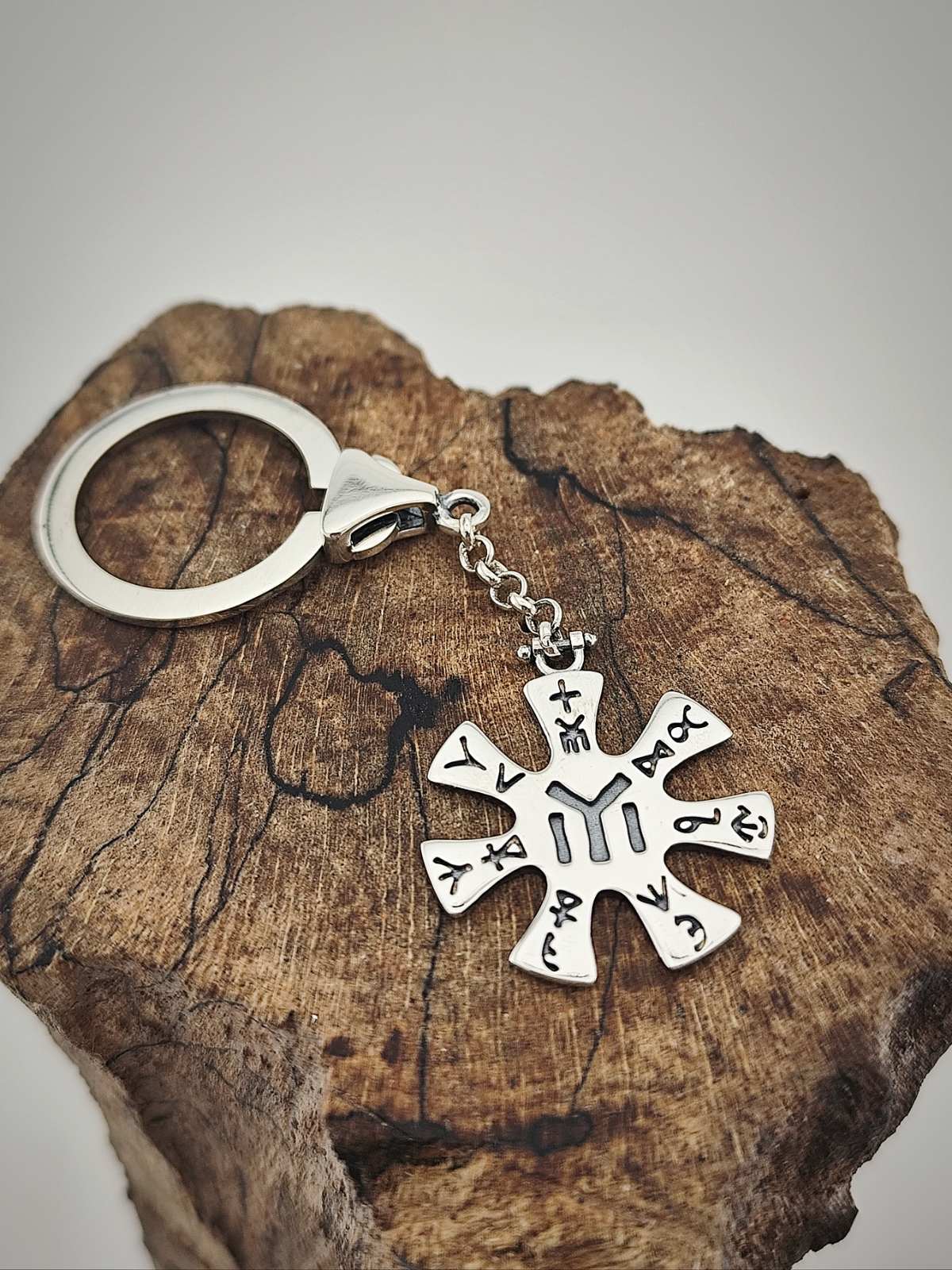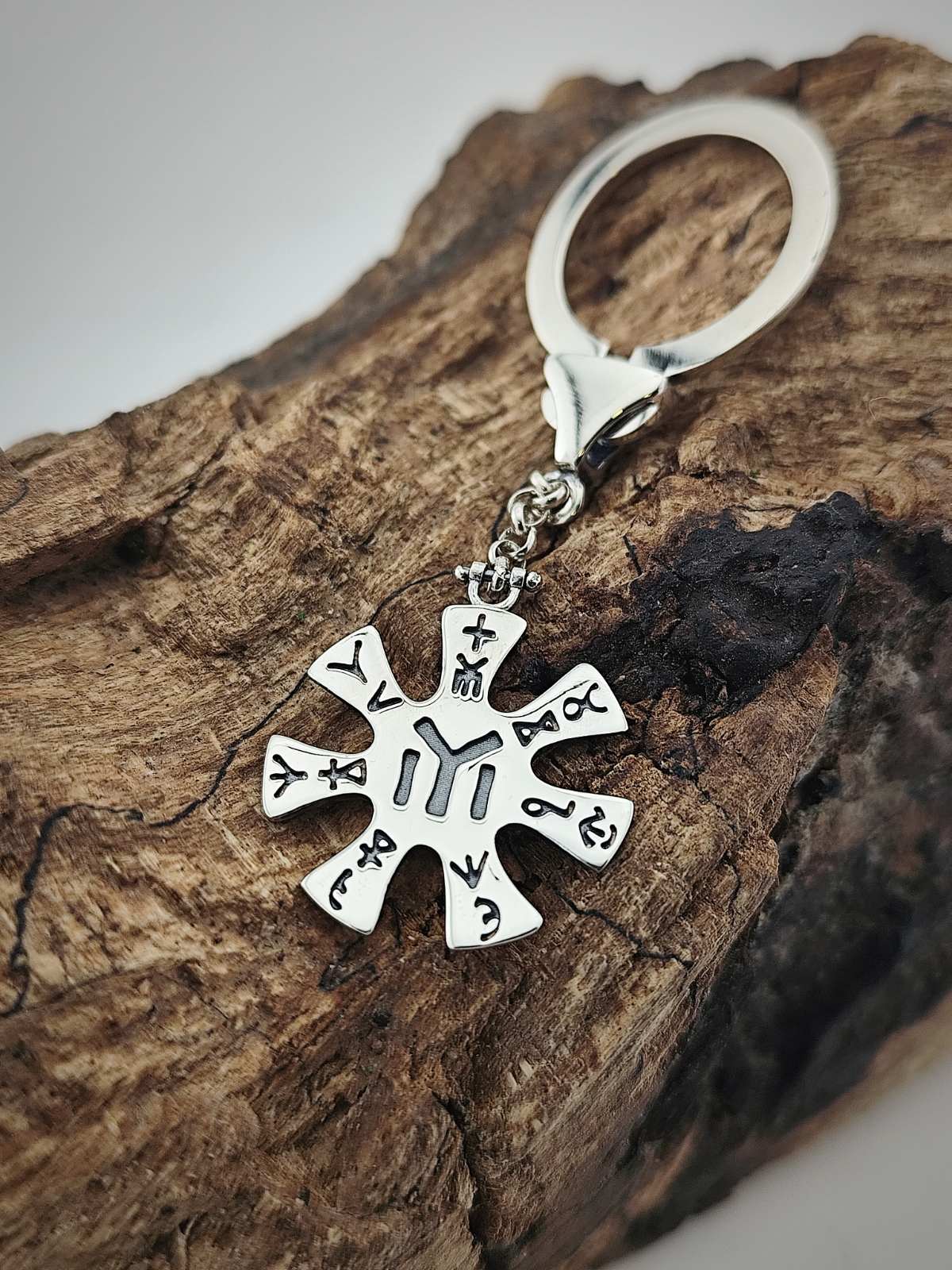 Сребърен ключодържател „Розета от Плиска“, ръчно изработен аксесоар от Студио Николас. Български производител на сребърна бижутерия за мъже и жени. Сребърен ключодържател от бижутерия Студио Николас. Ключодържателят е малък сребърен аксесоар, който служи за улеснена употреба на ключове. Състои се от халка и прикрепен за нея елемент, изработен от сребро 925. Дължината на ключодържателя, посредством сребърната верига позволява връзката ключове да се използва по-лесно, отколкото ако ключовете са свързани директно само с халката.