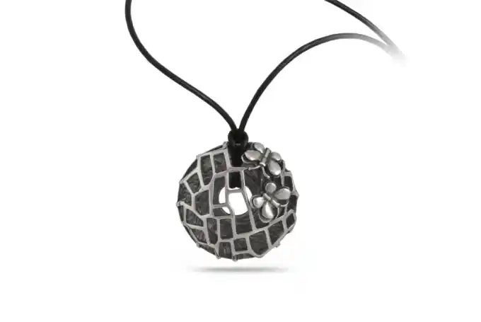 Дамски сребърен медальон 767m с кръгла форма и монтирани клетчици, с “кацнали” сребърни пеперуди. Обвивката е кожена, а закопчалката от 925 проба сребро.