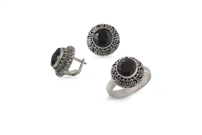 Дамски сребърен пръстен с оникс 1255R, част от сребърен комплект бижута с обеци на английско закопчаване и камъни оникс. Бижу с марката на Студио Николас! СЕРТИФИКАТ ЗА АВТЕНТИЧНОСТ.Сребърни бижута Studio Nikolas.