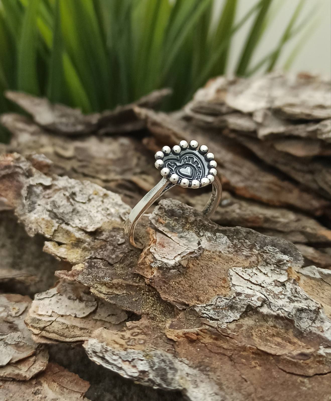 Сребърен пръстен с плътно оксидирано сърце – вълнуваща интерпретация на известната форма на сърцето.