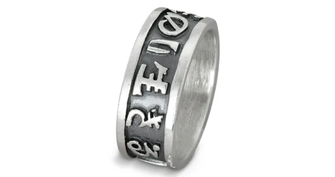 Сребърен пръстен тип халка с гравирани / релефни йероглифи, авторски модел 333T от фабрика за бижутерия Studio Nikolas. Сребърна проба 925 Ag. Мъжки сребърен пръстен от трайбъл серията на Nikol@s. Ръчна изработка, 925 проба, сребърна красота.