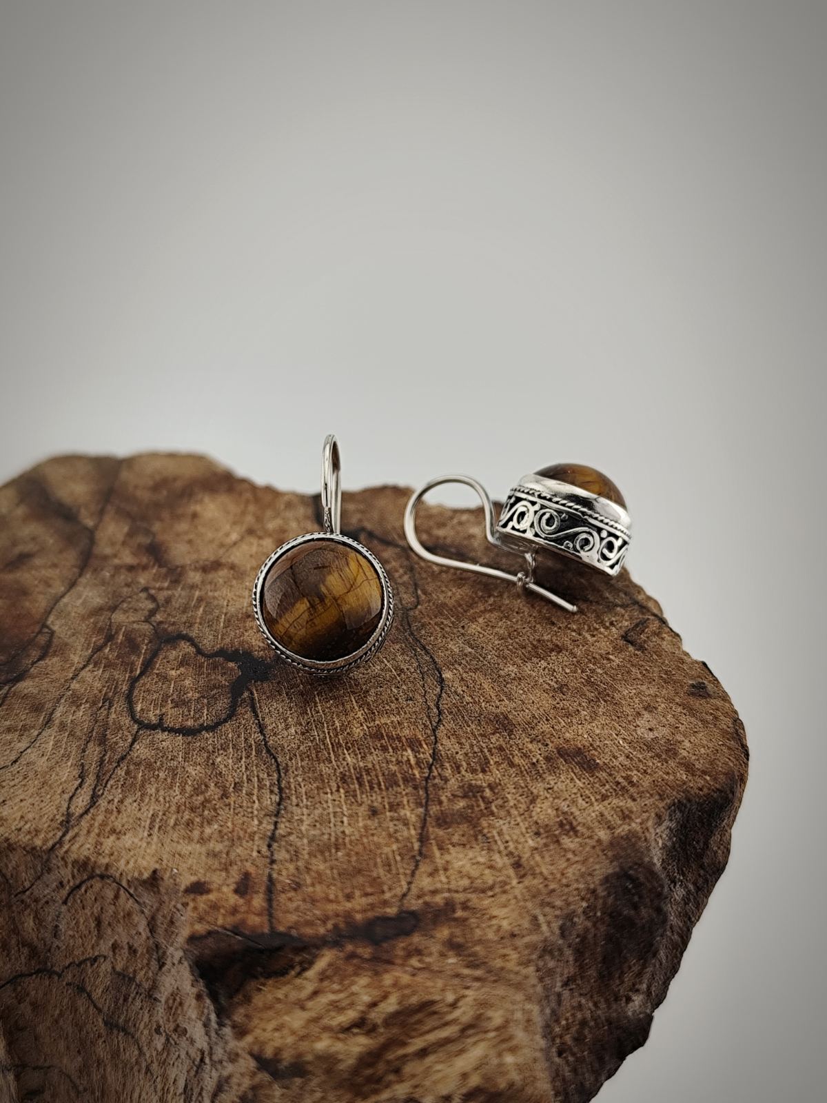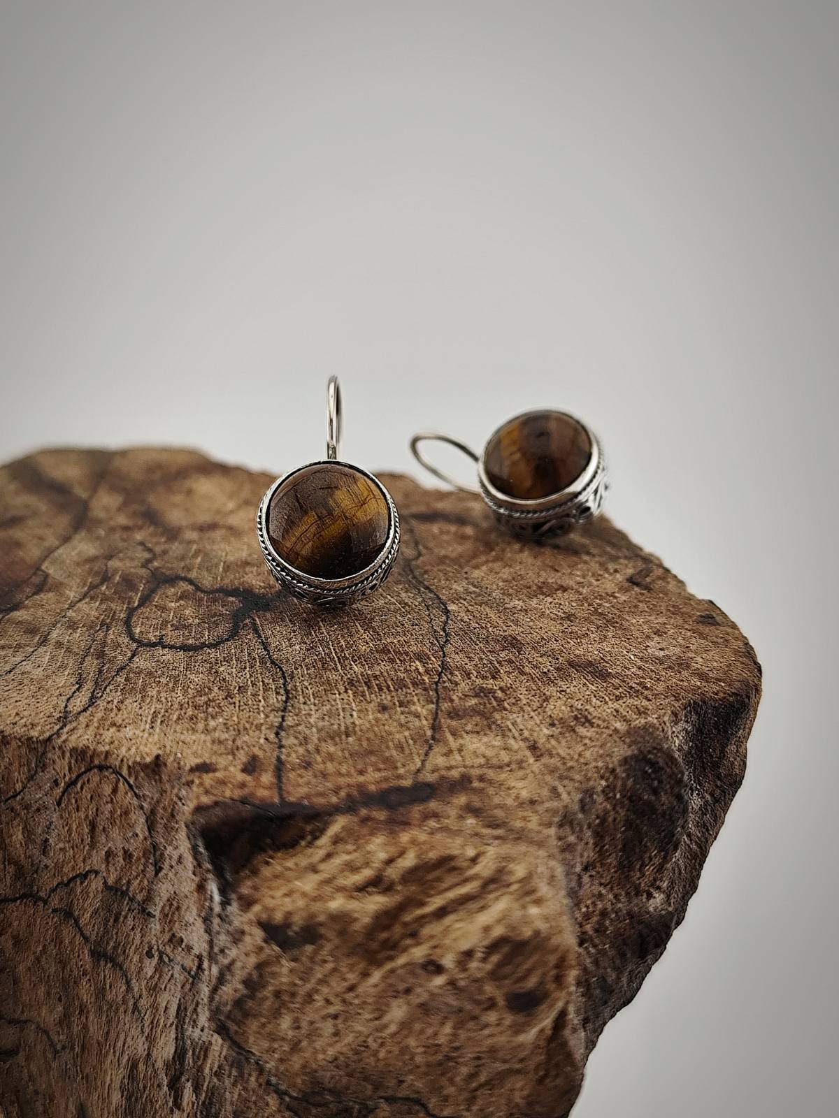 Обеци с естествен камък „Окото на Тигъра“.Висящи обици от сребро 925 и естествен камък, ръчна изработка от Студио Николас. Сребърни бижута за жена и подарък за любима дъщеря. Сребро проба 925, Sterling Silver. Популярно украшение още от дълбока древност. За древните египтяни и асирийци обецата е символ на високо положение в обществото. В древна Гърция и Рим обеците са били носени като знак на храброст. Изработените от сребро обеци, украсени със скъпоценни камъни са се носели с гордост от римлянките и гъркините, с което са показвали принадлежност към висока социална класа. Дамски сребърни обеци с естествен камък 1251Е.