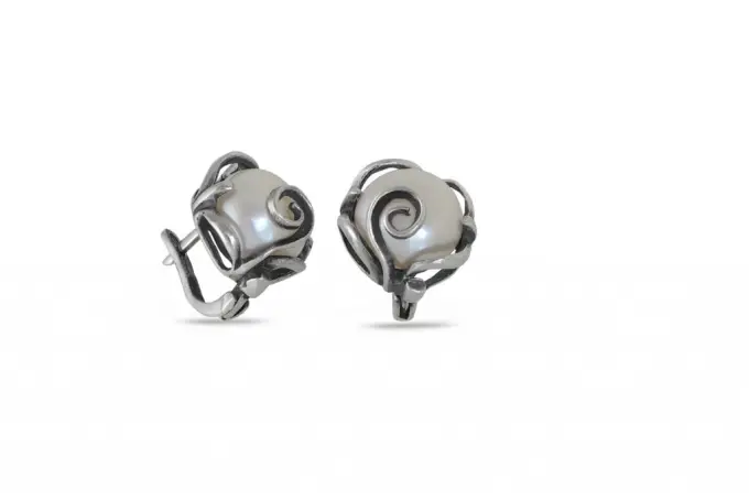 Дамски сребърни обеци с перла 1121E. Обеци във формата на стилизирано цвете, което е инкрустирано с речна перла. Модел 1121E на Студио Николас, български производител на сребърна бижутерия за мъже и жени.