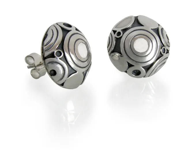 Дамски сребърни обеци инкрустирани с емайл, модел на щифт 297E на Студио Николас. Производител на сребърни бижута за жени! диаметър : 15 мм.