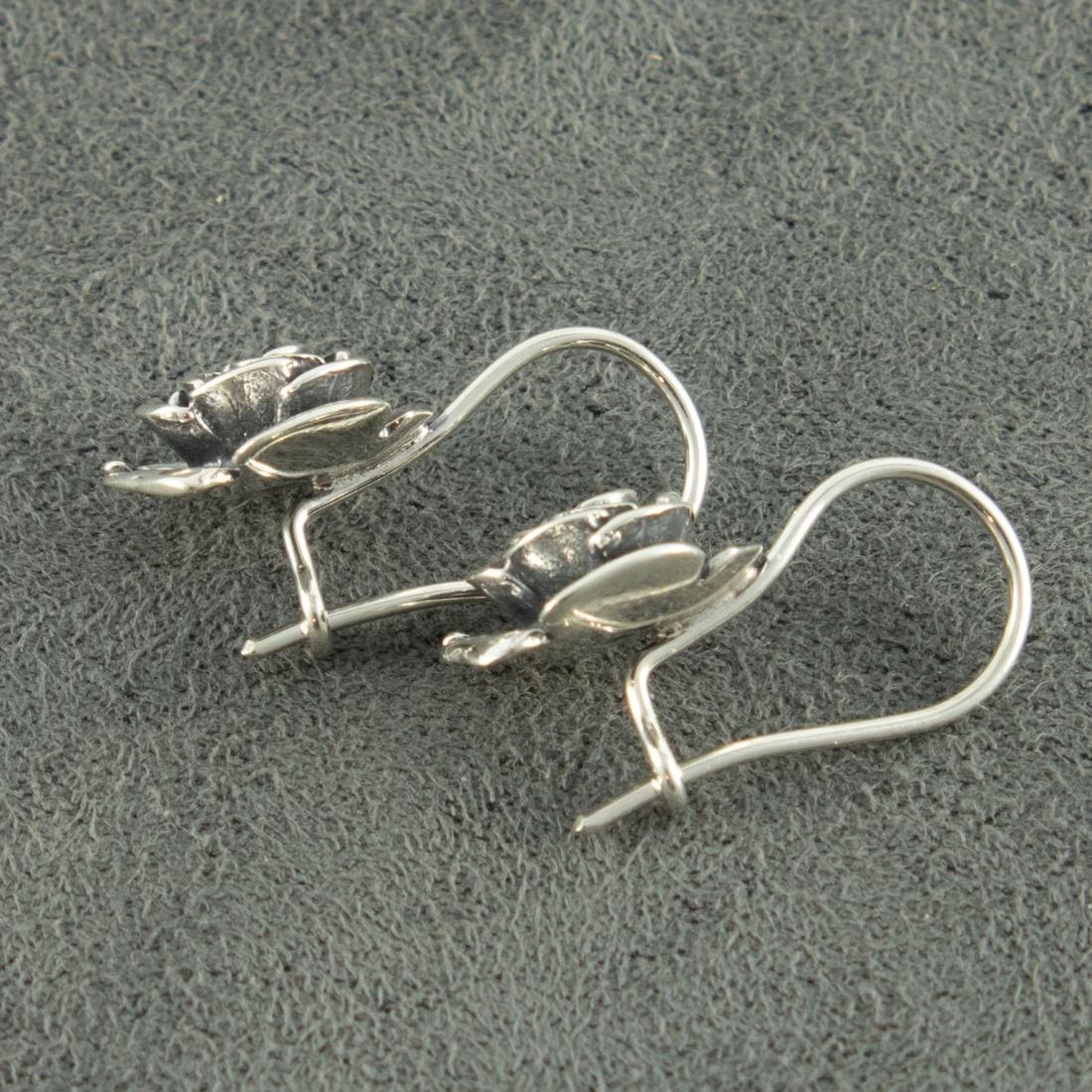Обеци с форма на роза изработени от оксидирано сребро проба 925, закопчаване на върбило. Каталожен номер 845E на сребърни бижута Студио Николас.СЕРТИФИКАТ ЗА АВТЕНИЧНОСТ
