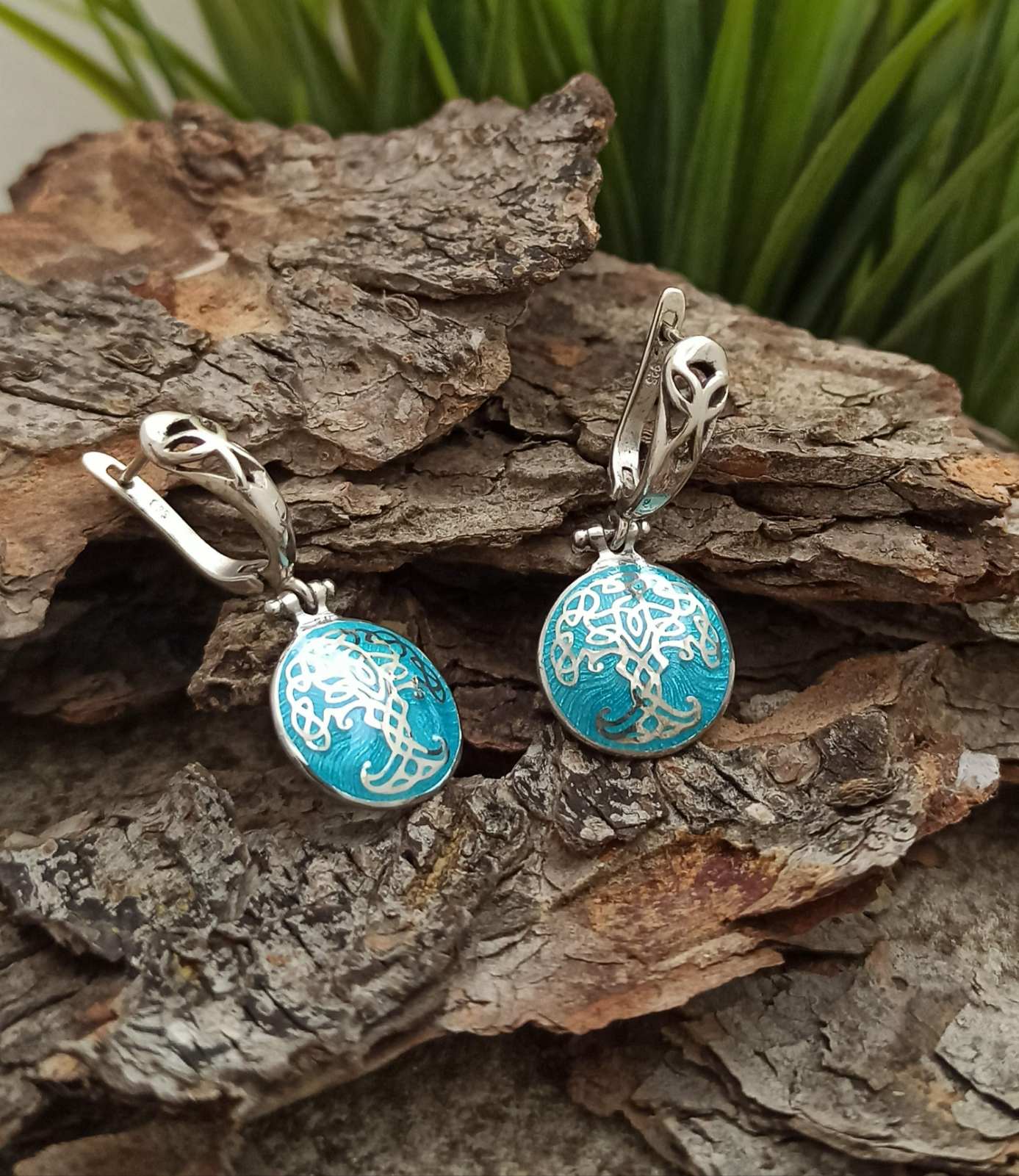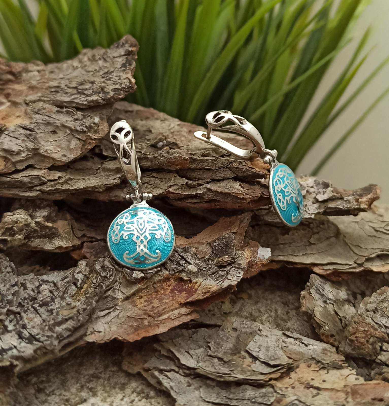 Сребърни обици „Дърво на живота Yggdrasil“ с  украсата на тюркоазено син естествен емайл. Дървото е символ на живот, могъщество, дълголетие, щедрост, търпение, покровителство. В неговата символика и боготворене намира отражение обожествяването на природата. Всяка култура има свое Дърво на живота. И всеки бог си има свое свещено дърво.