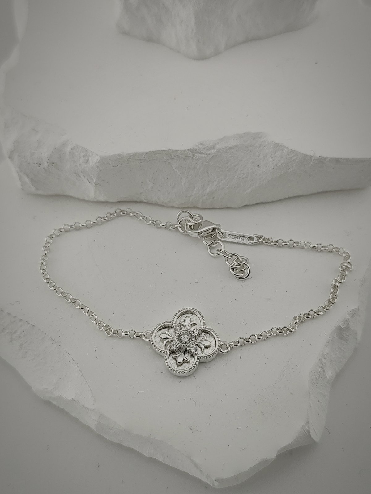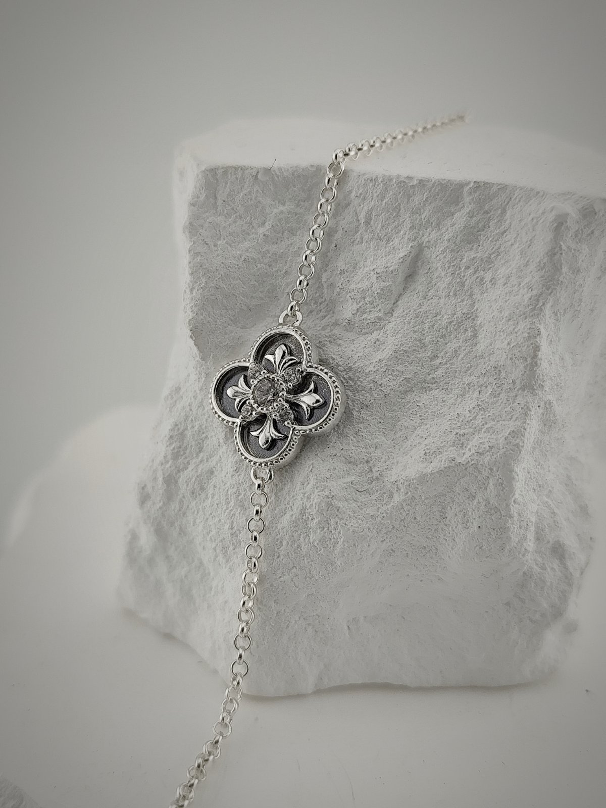 Орнаменталният елемент е внимателно оформен, а поставянето на петте циркона изисква точност, за да се запази симетрията и балансът на формата. Фините детайли и релефът създават усещане за дълбочина, въпреки малкия размер.