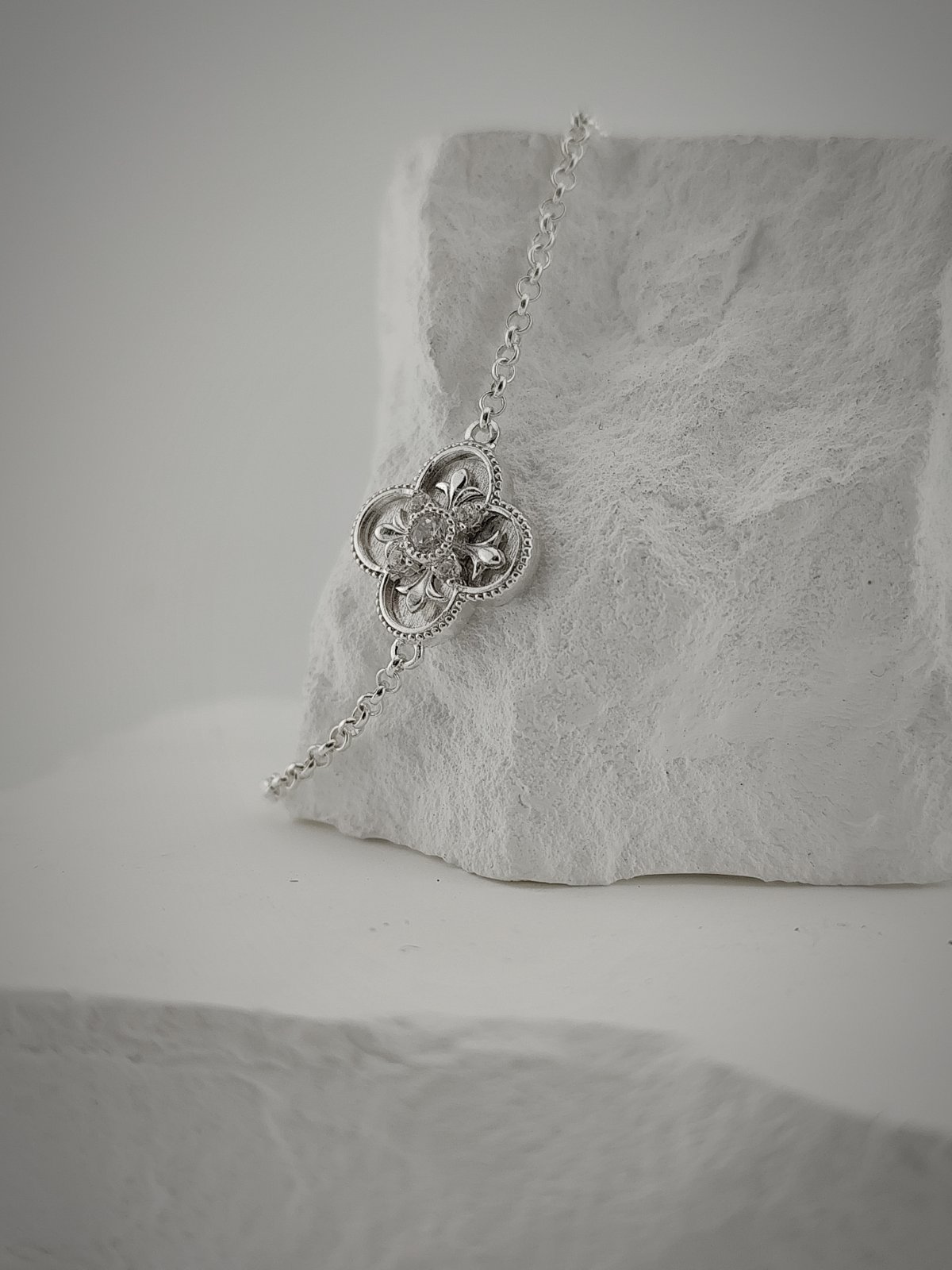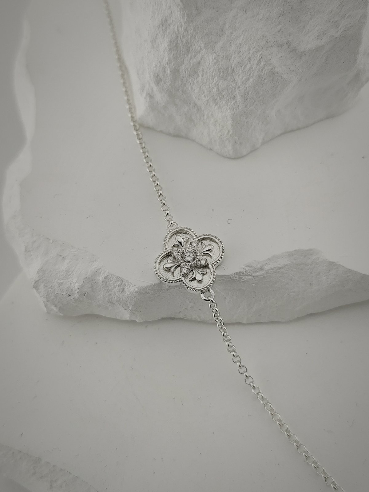 В центъра е разположен характерният елемент с един централен циркон, обграден от четири по-малки камъка, създаващ балансирана и завършена композиция. Формата е вдъхновена от класическите декоративни мотиви, изградени около симетрия и ясно изразен център.