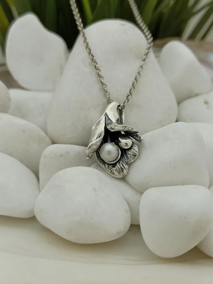 Дамски сребърен медальон с речна перла ръчно изработен модел 1070M на Студио Николас. Част от сребърен комплект бижута.