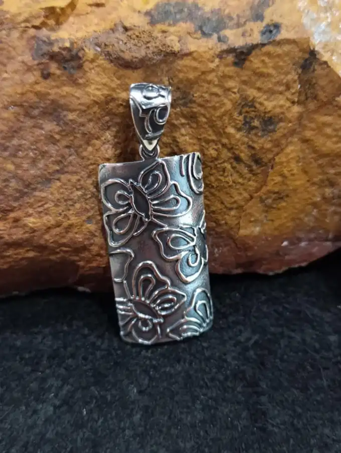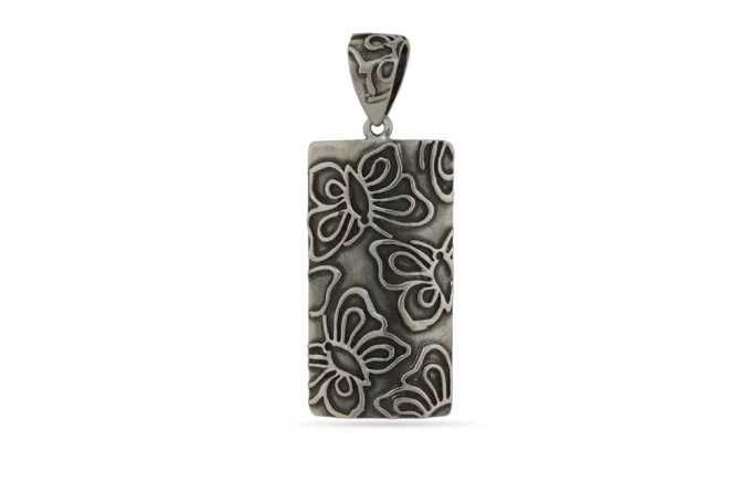 Сребърен медальон 1367M с правоъгълна форма и с релеф на пеперуди от 925 сребро – Студио Николас. Прекрасен подарък за любимата жена. Масивна сребърна висулка с проба на среброто 925 и сертификат за произход. СЕРТИФИКАТ ЗА АВТЕНТИЧНОСТ