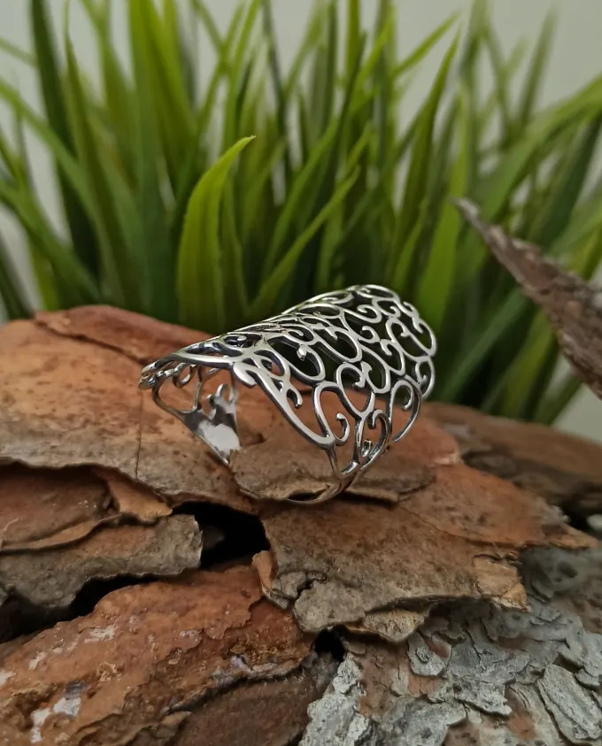 Дамски сребърен пръстен 1188R – Студио Николас. Ажурен пръстен от сребро с проба 925, модел “КОНУС” по дължината на пръста: 38 мм, който е много удобен за носене.