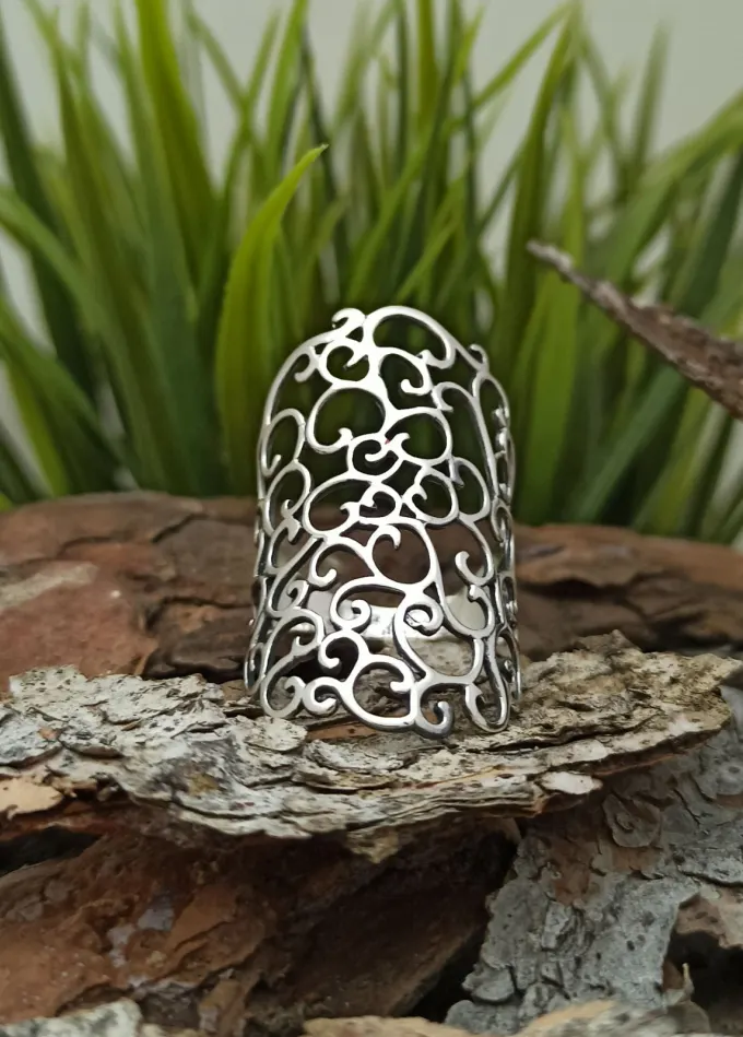 Дамски сребърен пръстен 1188R – Студио Николас. Ажурен пръстен от сребро с проба 925, модел “КОНУС” по дължината на пръста, който е много удобен за носене. дължината по продължение на пръста е 38 мм.