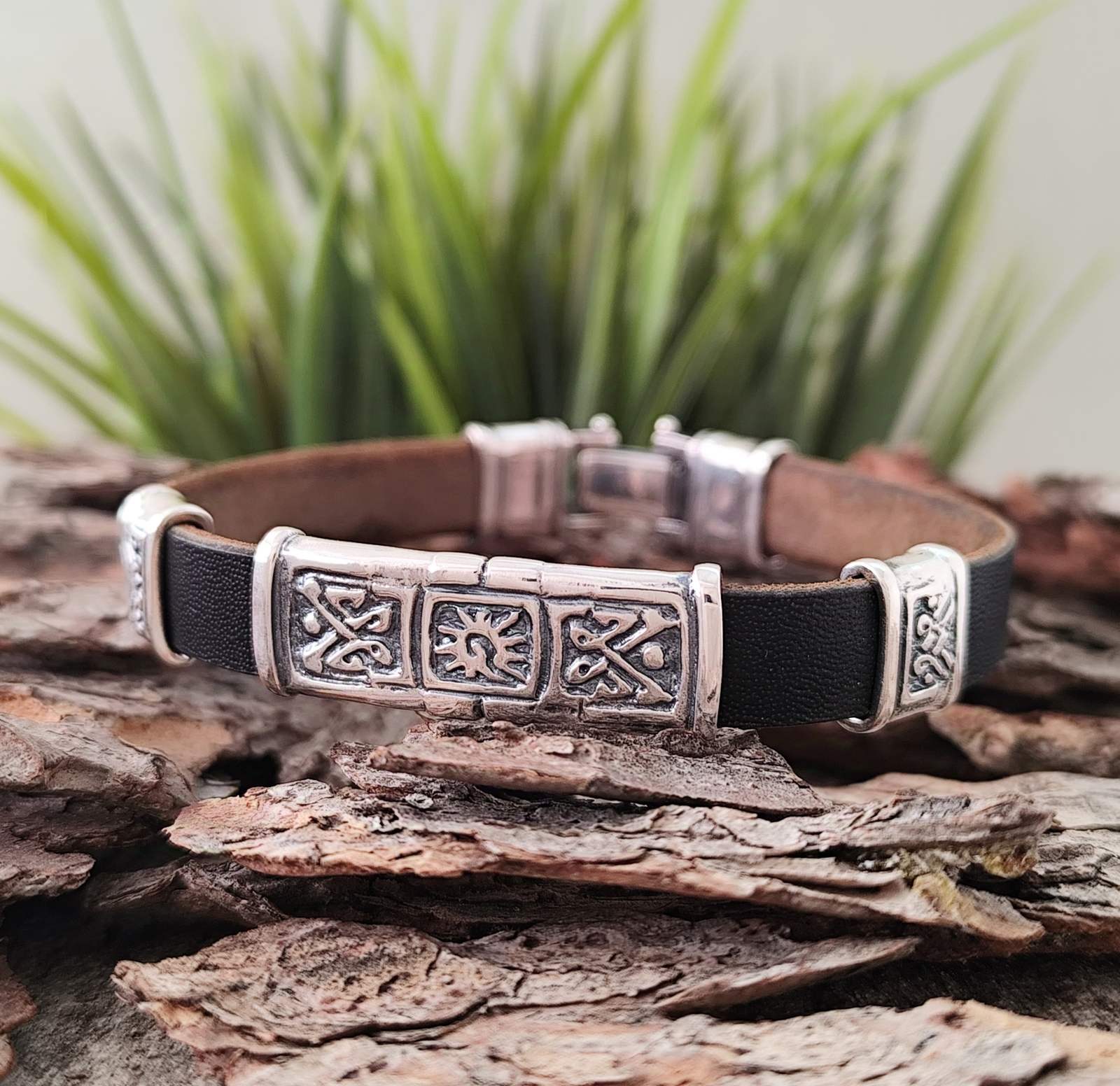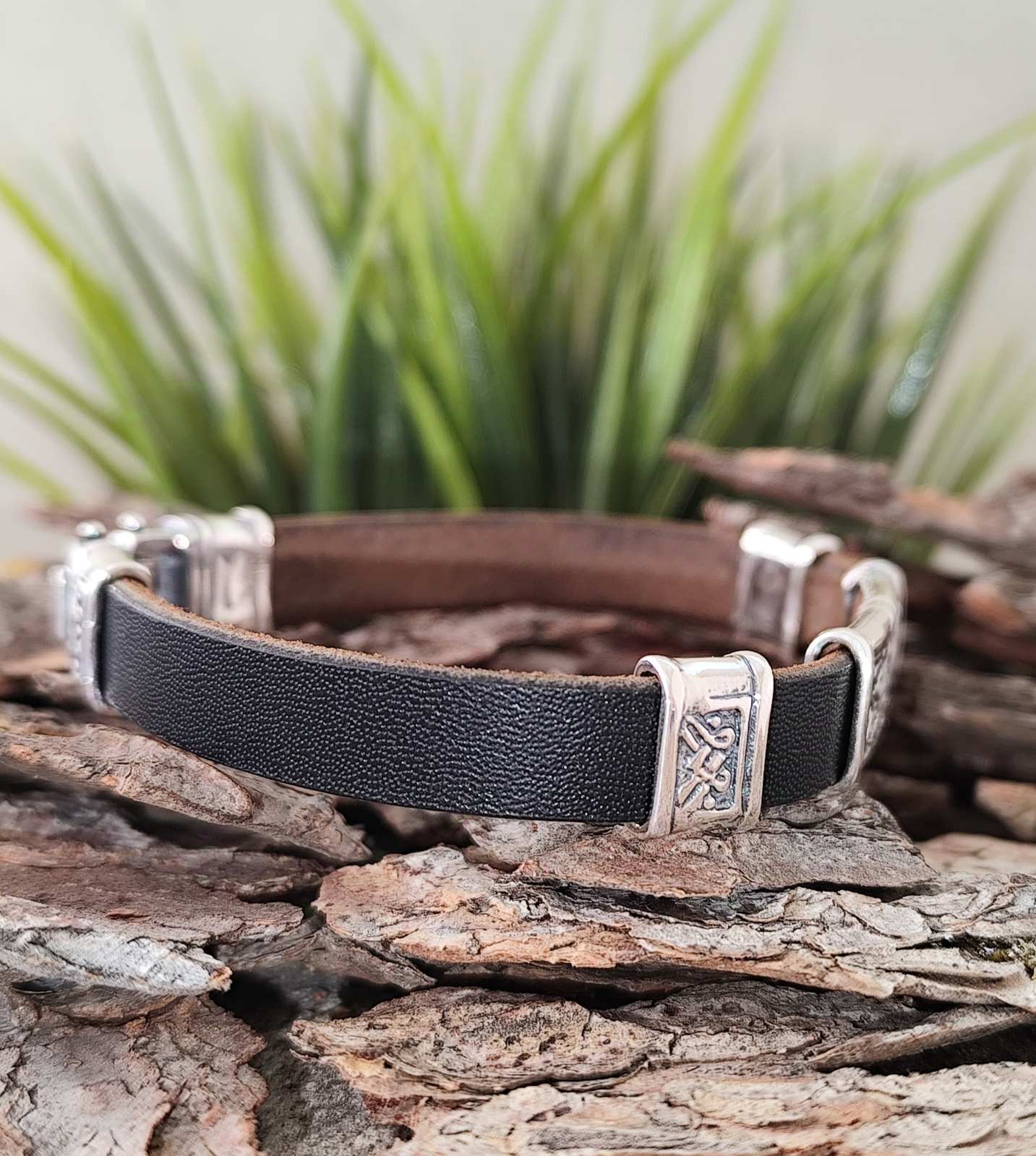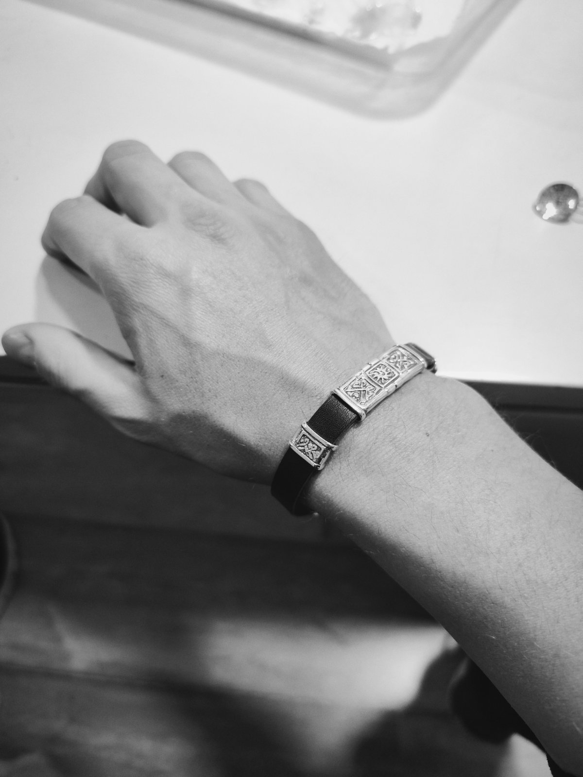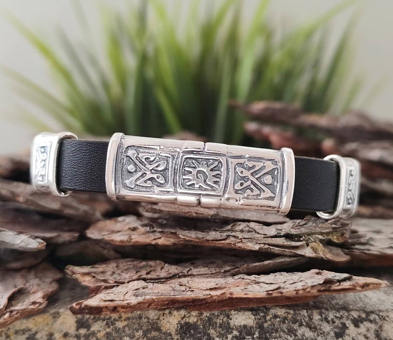 Мъжка сребърна гривна с кожа 805B от Студио Николас. Изработка – кожена каишка, масивна сребърна плочка с орнаменти. Допълнена с две сребърни скоби  и ефектна сребърна закопчалка.